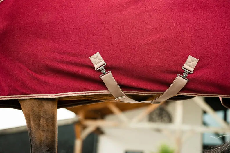 Designed with both functionality and style in mind, this cooler features a single front closure for easy fitting, along with a fillet string tail cord to help keep it securely in place. Two removable cross surcingles provide added versatility, allowing the rug to double up for stable wear or transport. The high-quality fleece material not only feels luxurious but also maintains its appearance over time, resisting pilling even with regular use.