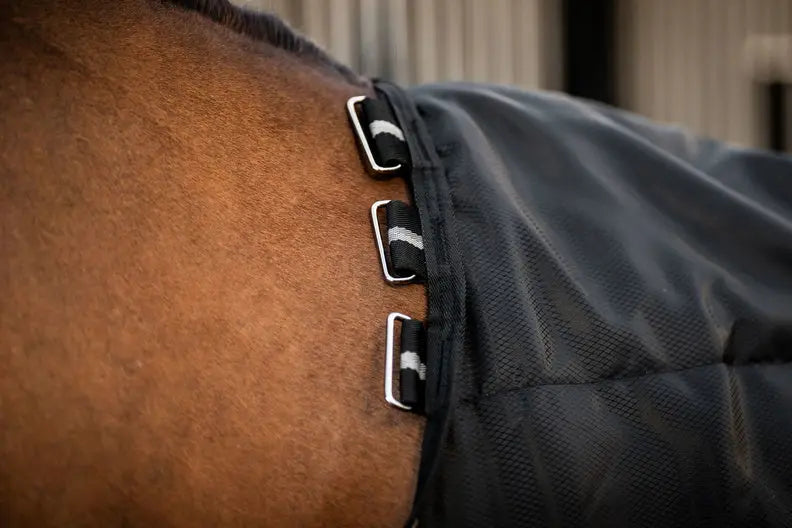 Crafted with a robust 210D Polyester Diamond Ripstop material, the outer layer showcases a reinforced Ripstop weave in an elegant diamond pattern, ensuring exceptional durability. The inner layer features a plush microfibre lining, enhanced with 200g of fibrefill for the ideal level of loft and heat retention to keep your horse comfortable in colder weather. The classic cut design with a straight front closure, complemented by two cross surcingles and a tail strap offers a secure fit and prevents any unwarranted slipping.
