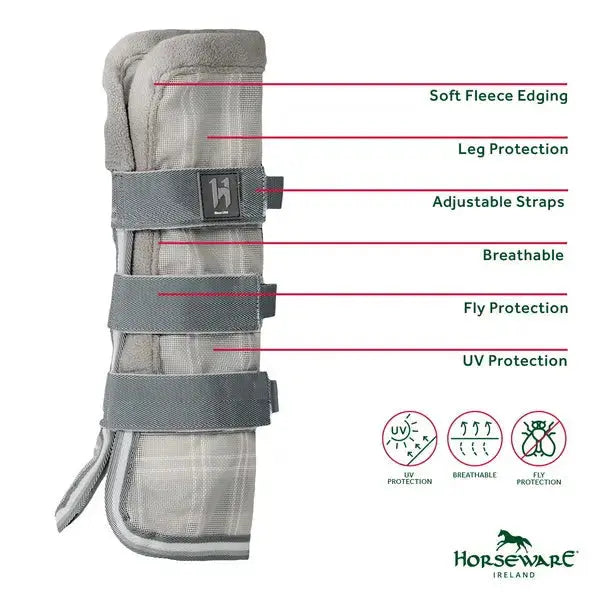 Woven of polyester mesh with PVC coating, the fly boots allow air flow while remaining tough enough for long-lasting use. Soft fleece edging helps prevent rubs and discourages flies from getting underneath boots.