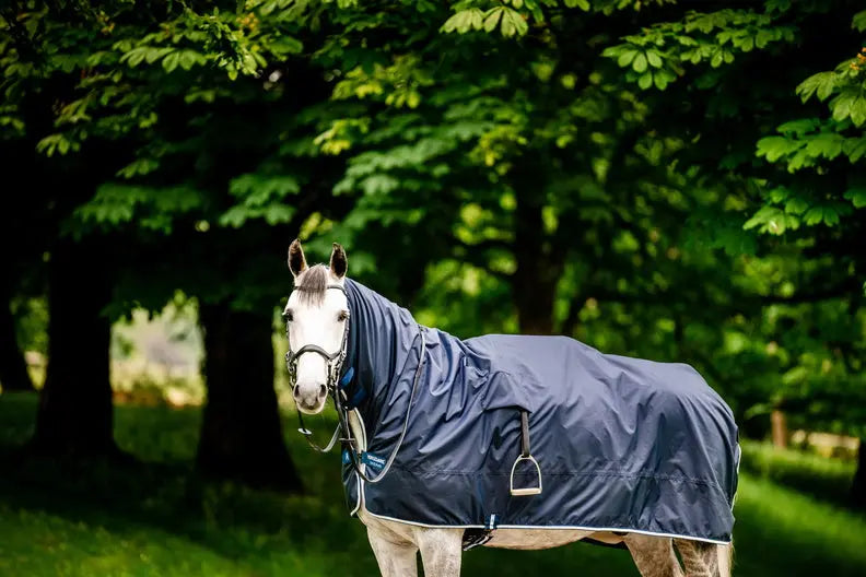 Integrated hood and stirrup leather slots offer a streamlined look. Two neck and one front closures, detachable hidden surcingle, and two tail straps provide secure fit while riding.