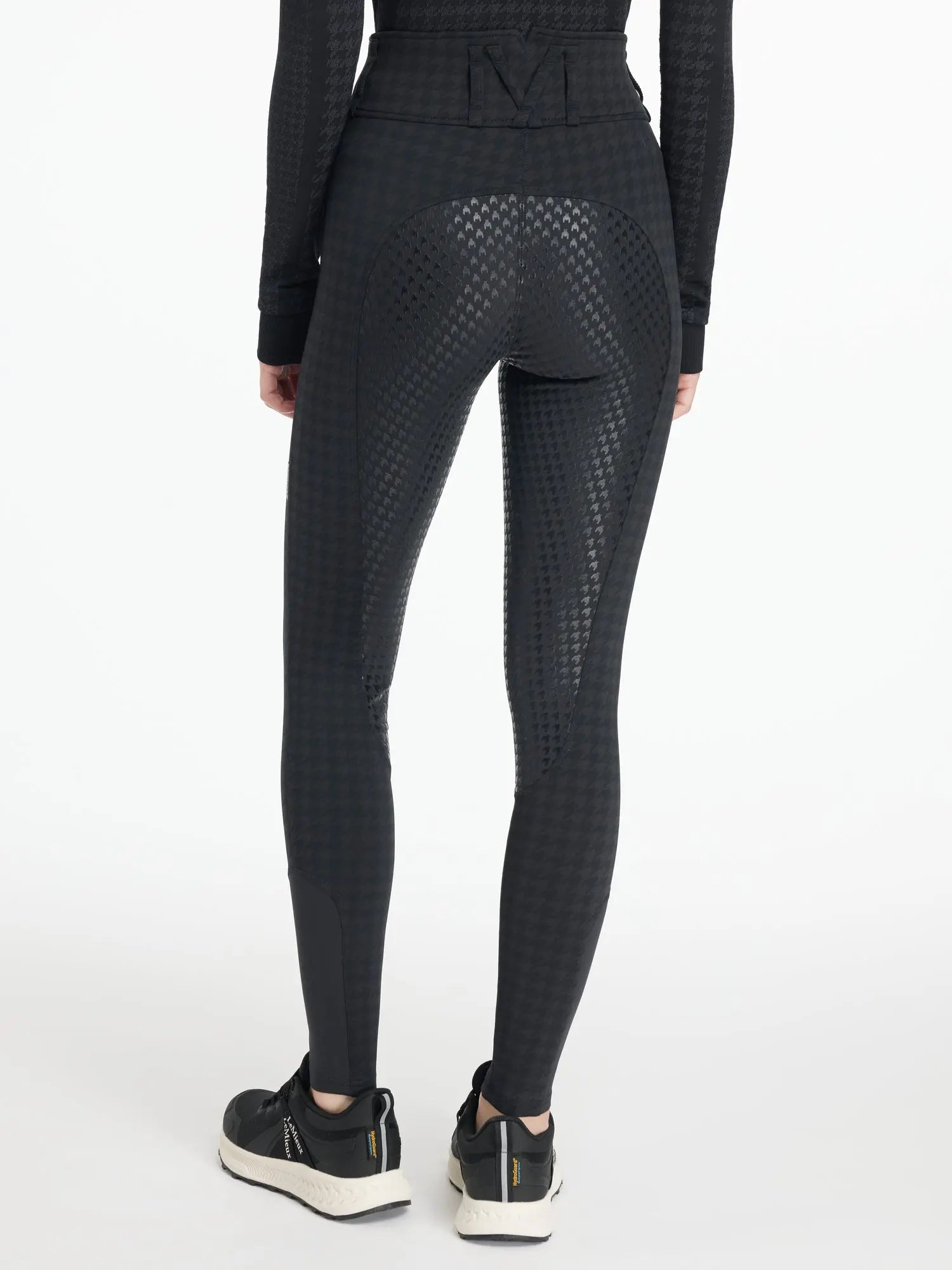 Conquer all your challenges in these stunning high-waisted breggings. They boast all the comfort of a legging, with the structure and finishing touches of breeches. The comfortably high waist cut features a criss-cross belt loop at the centre back. The houndstooth fabric is shaped for hold in all the right places, for flattering support where needed. Full-seat houndstooth print silicone offers grip for stability and security in the saddle. The LeMieux branded lower leg is laser cut to reduce bulk under boots.