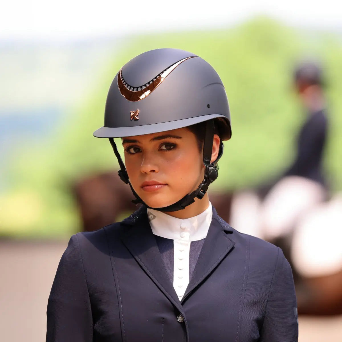 Low profile form. Smooth, lightweight, high shine matt outer shell.Contrast rose gold halo for an eye-cathing look.Neat and flattering wide flexible peak, a real favourite in the showjumping ring.Bespoke fit micro-adjustable dial system to help you achieve a comfortable, secure fit.Maximum cooling effect thanks to passive ventilation halo.CoolDryTM headband which is machine washable and can be removed and replaced.Expanded polystyrene inner shell with ventilation holes.Fully adjustable 4-point harness with leather-look side panels.Quick-release harness buckle.Removable anti-rub chin guard.PAS 015:2011 and BSI Kitemark.This lightweight, adjustable horse-riding helmet is the perfect choice for those looking for a subtly stylish hat for competition or everyday wear.