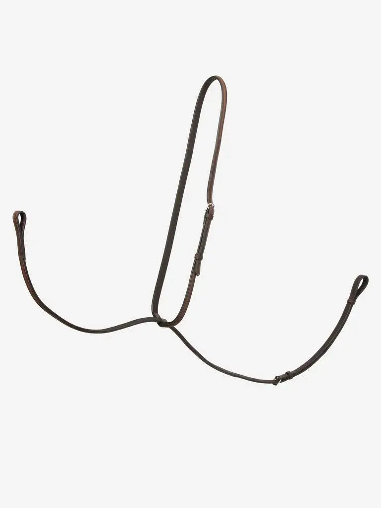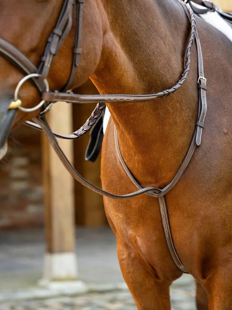An expertly designed Hunter discipline class essential, this standing martingale is made from traditional American leather. Pre-oiled, supple and strong, this premium leather martingale has authentic stitching details that will stand the test of time. The standing martingale has a single fixed strap that attaches to the cavesson noseband, a buckle neck strap and an adjustable strap that passes between the front legs for the girth to pass through. Team with the Hunter Stitched Bridle and Hunter Leather Laced Reins.