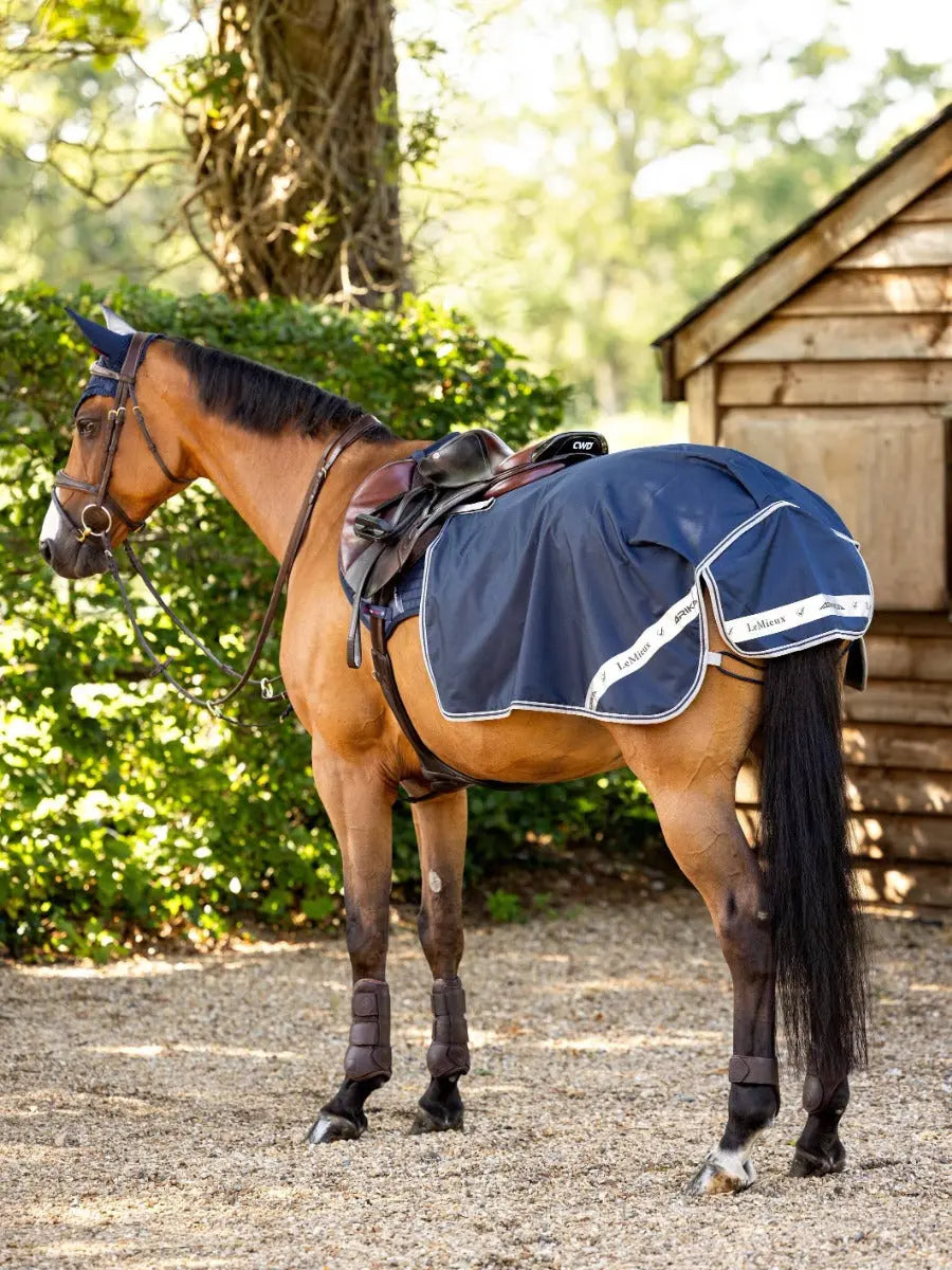 The smart LeMieux Arika Waterproof Quarter Sheet has been developed to protect the horse's coat from the elements and prevent chills during warm-up and hacking. It's a wet weather essential, designed with a waterproof outer and microfleece lining to keep your horse warm and dry. It also works to disperse sweat which regulated the horse's temperature and prevents any condensation. The addition of reflective panels keeps you and your horse safe and visible.
