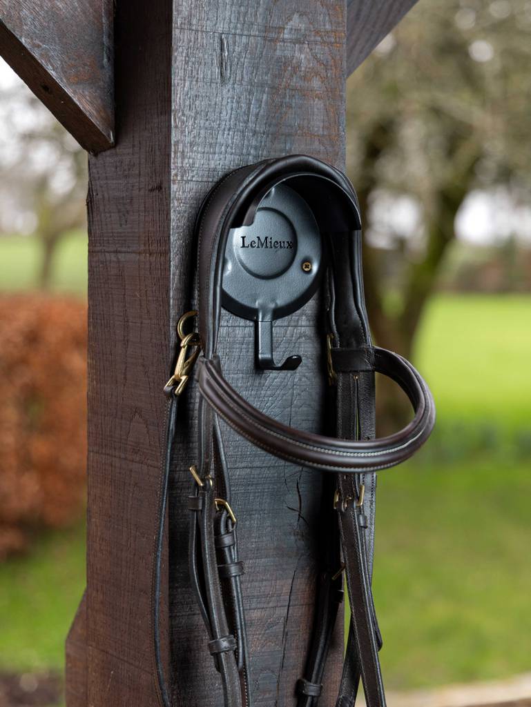 - Classic tack room essential - Strong metal hanger with screw holes - Wide half-moon support for your bridle headpiece - Handy hook for reins