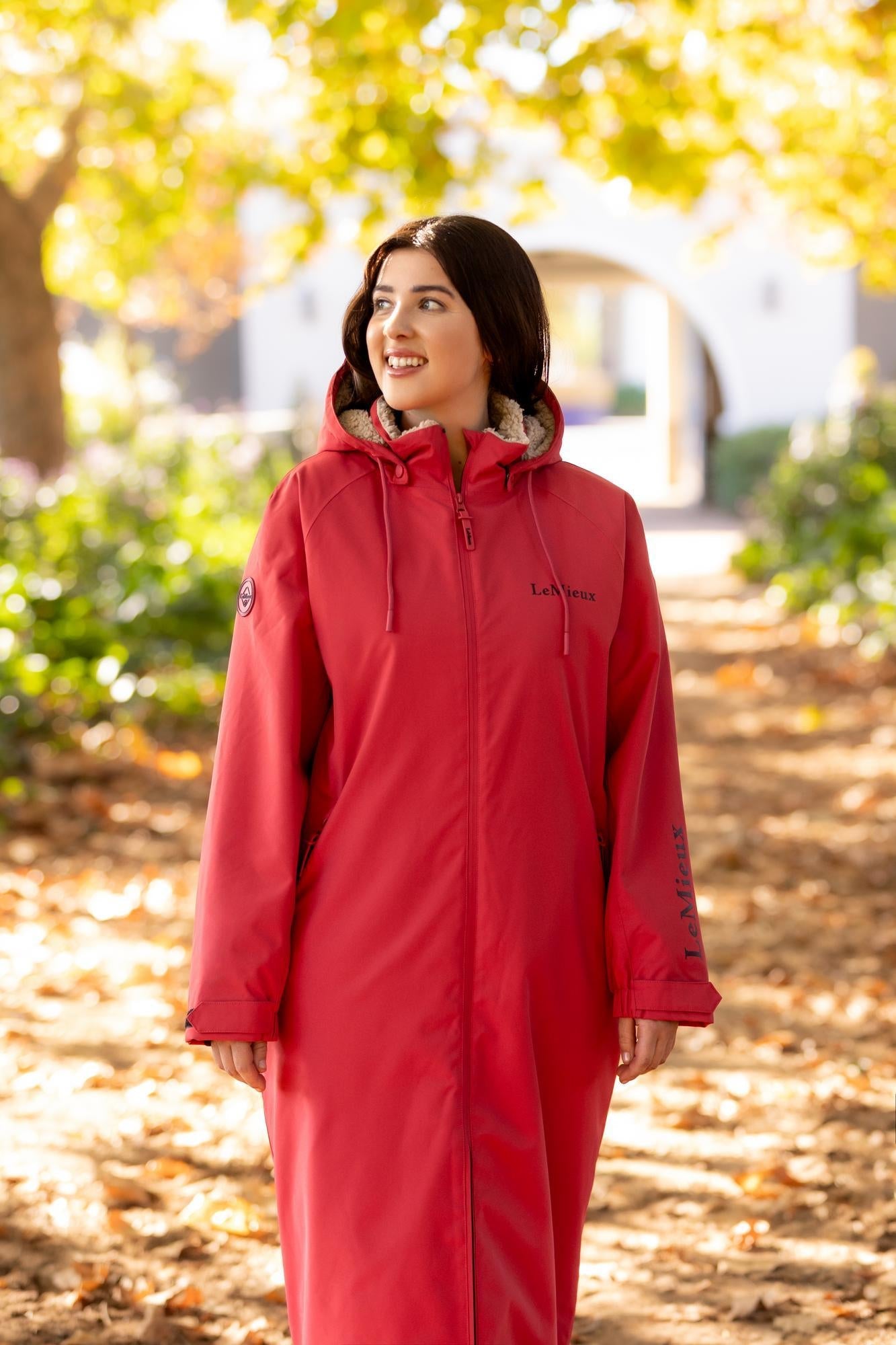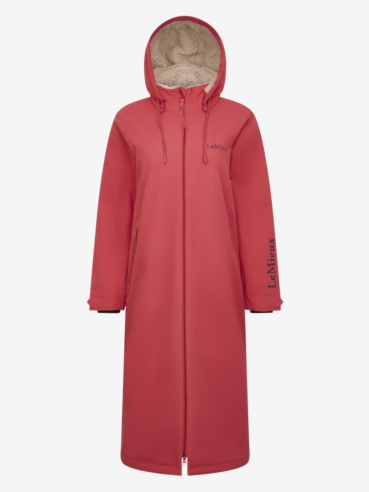 Shelter from the storm in this full-length, oversized, waterproof coat with a moisture-wicking fleece lining. Perfect for riding, changing and even running errands, it's big enough to throw on over clothing and cosy enough to dry off in. It's waterproof to 12,000mm with fully welded seams, inner storm cuffs, and a detachable hood. The breathable fabric has a 10,000mvp rating - ideal for working hard without overheating. There's plenty of pocket space for warming your hands and stashing treats in the deep zipped pockets. A two-way front zip gives you flexibility, while the back hem vent allows for fitting over the saddle. The PFC-free outer fabric is durable and ideal for life with horses. With statement LeMieux branding print and all the finishing touches you expect from LeMieux, this is the best way to stay dry - or dry off - on a wet ride.
