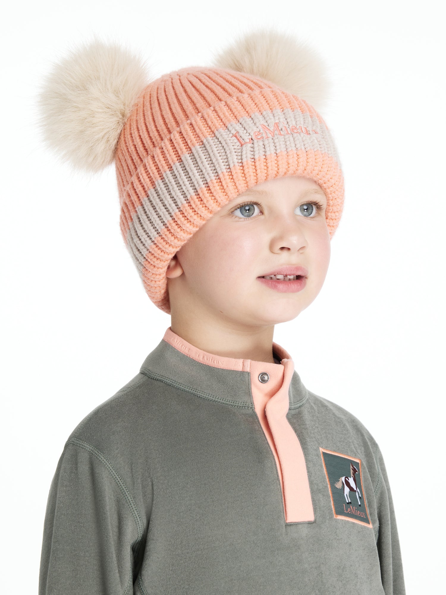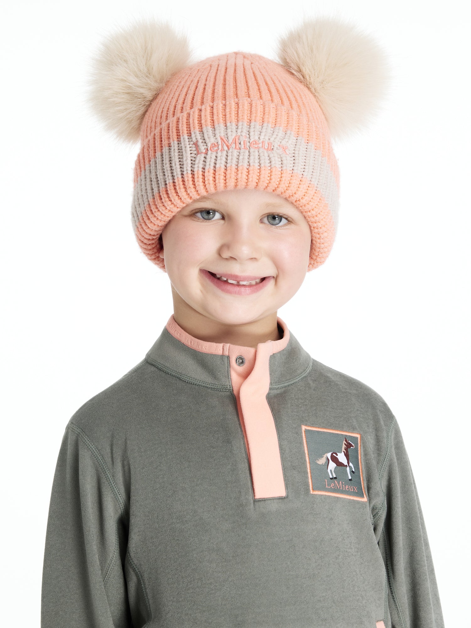 This chunky double row knit beanie will keep your mini rider warm all winter. Featuring two detachable neutral-toned fluffy pom poms, this hat is lined with super soft microfleece, keeping little heads and ears cosy when exploring the outdoors. The fold-over cuff and faux leather LeMieux emblem add a stylish finishing touch.