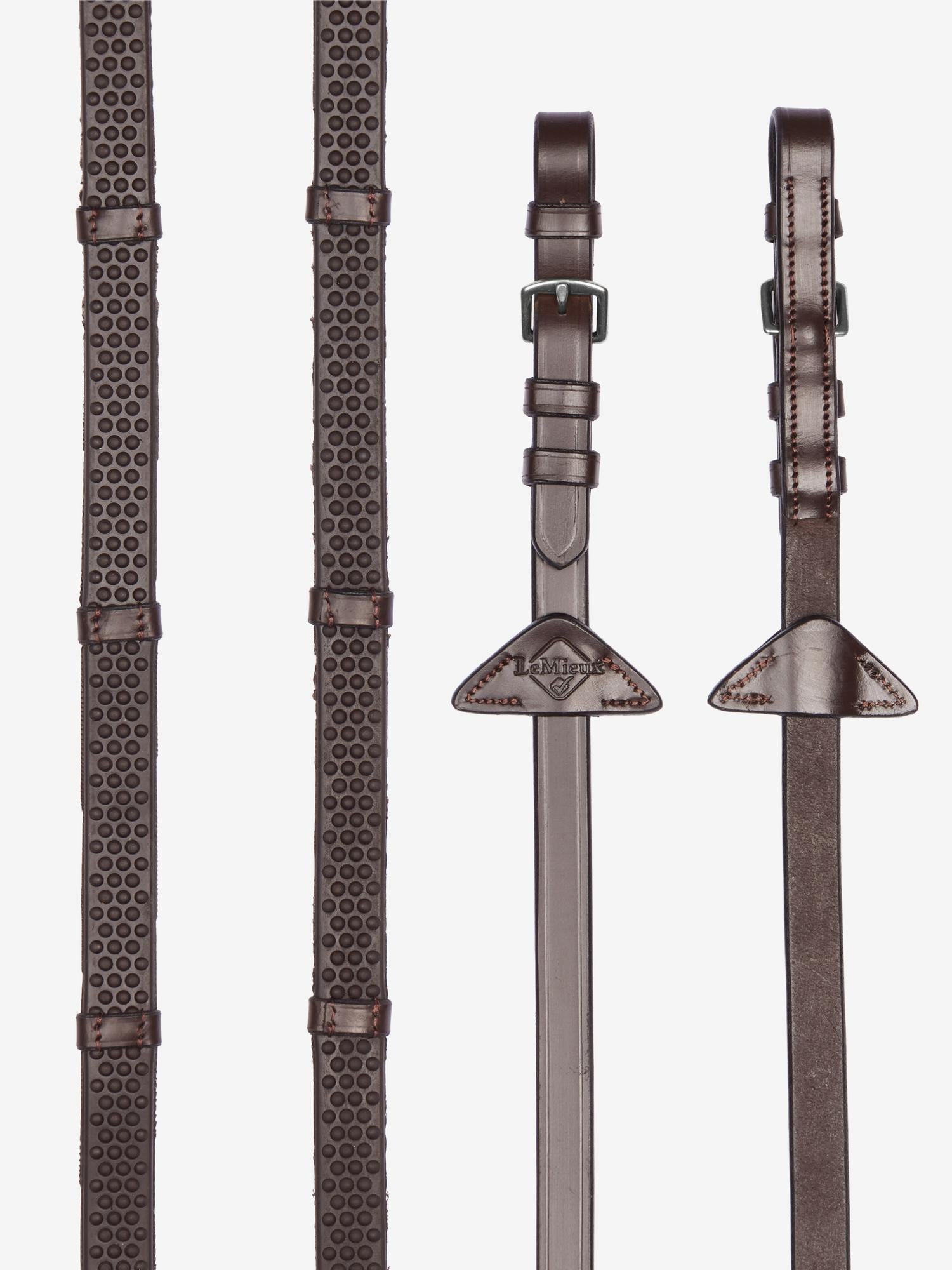 Soft and flexible reins with leather stoppers at comfortable intervals - Light feel in the hands - Raised pimple texture for secure grip - Nylon lined to prevent stretching - LeMieux branded leather martingale stoppers - - -
