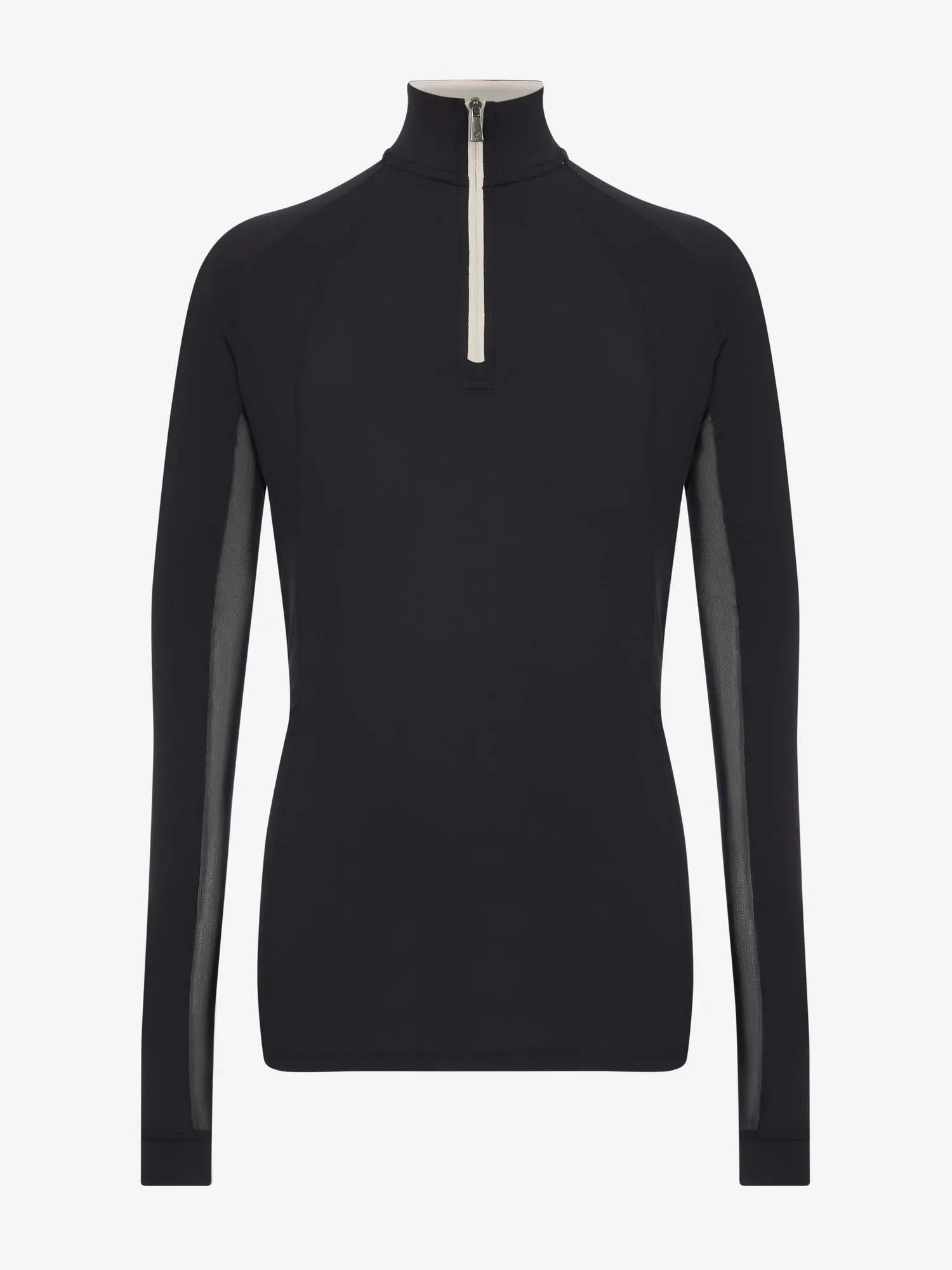 Beat the heat in this ultra-lightweight Base Layer. Ideal for hotter climates, its UV30+ fabric protects you from the sun's harsh rays, while a cooling treatment makes it comfortable to wear in any temperature. Its lightweight and soft fabric, combined with a quarter zip, 360° stretch, and antimicrobial properties, ensures a comfortable fit. Mesh under the sleeves provides extra ventilation, making it ideal for all outdoor activities. The discreet LeMieux logo branding is a mark of quality and a symbol of style, ensuring you look your best while staying protected.