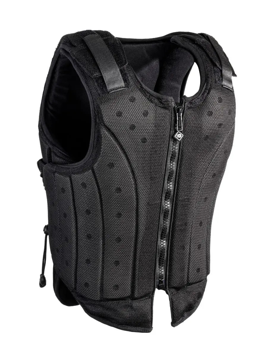 This zip fronted horse riding body protector is designed to be unisex and suits the junior shape perfectly for ultimate safety. This junior horse riding body protector features bungy side fasteners to toggle the fit with adjusters on the shoulder to ensure a perfect fit is achieved to maximise safety; this is one of the only flexible block body protectors featuring the benefit of shoulder adjusters for an improved fit.