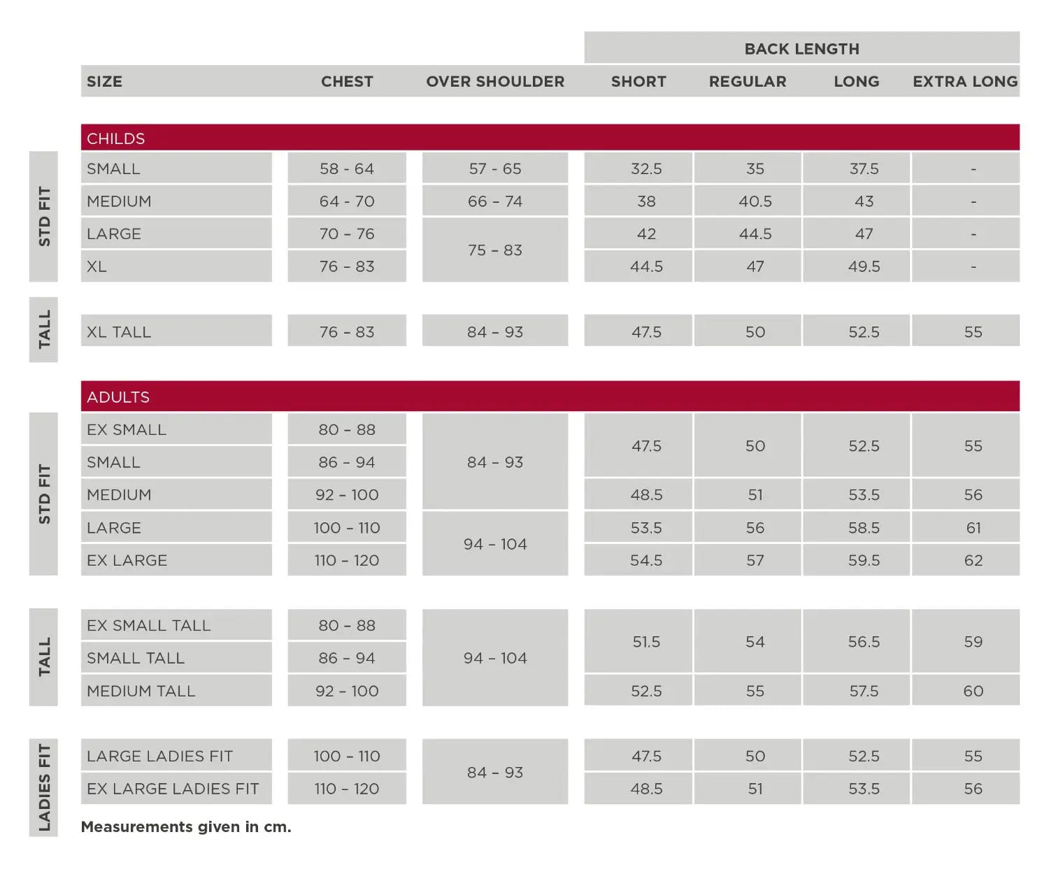 Available in children's sizes from Small to XL, in back lengths Short, Regular, Long and X Long.