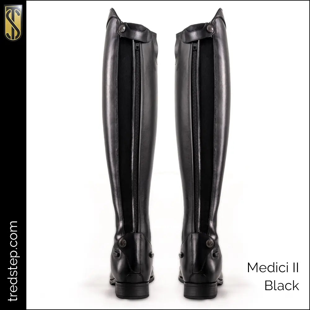 Meticulous craftsmanship and sumptuous hand-sourced calfskin leathers envelope and enhance the natural shaping of the rider's leg, The Medici II combination of anatomical shaping with a new high tensile stretch panel and heavy-duty rear zip ensures a really secure contoured fit. The introduction of a new cushioned elastic easy closure at the top of the boot provides more comfort behind the knee. Mounted on a revolutionary cushioned rubber outsole which combines a classic profile with the latest in sole technology, this coupled with a coolmax lined cushioned footbed, ensures advanced stirrup grip and ankle flexibility while reducing foot fatigue. The Medici II combines a sophisticated style with superior function that makes it a winner in any arena.