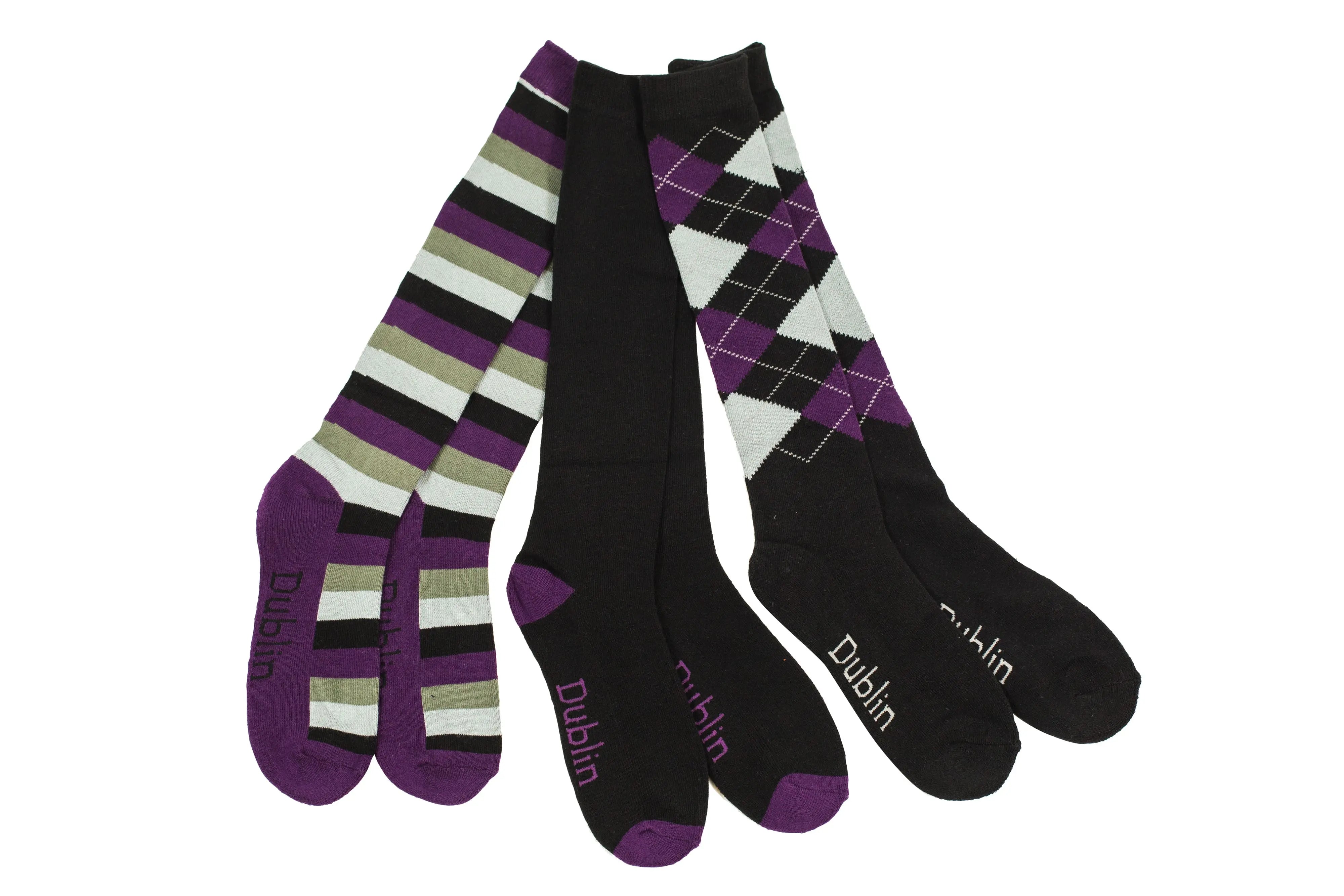 The Dublin Knee Length Socks come as a 3 pack and are an ideal everyday riding sock, made from naturally breathable stretch cotton to keep your feet comfortable and dry. Supplied in assorted designs to perfectly match your riding wear; one size (UK 3.5 - 8). These make superb stocking fillers for Christmas!
