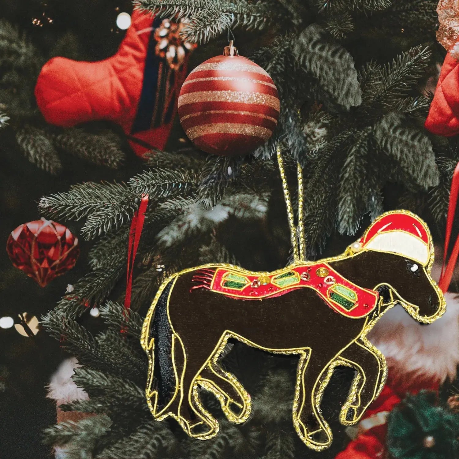 Introducing our delightful collection of festive keepsake decorations, specially designed to add a touch of charm to your festive fir. At Equetech, we offer an array of meticulously crafted Christmas tree decorations that are sure to captivate your heart. Our equine-inspired designs, including this majestic Bay Horse, reflect the joy and spirit of the holiday season. Each decoration is thoughtfully adorned with handmade beads, embracing traditional Christmas themes. The use of rich velvet fabrics and festive embellishments further enhances the elegance and sophistication of our creations. We understand the sentimental value that Christmas decorations hold, and that's why we take great pride in ensuring that our ornaments are crafted with the utmost care and attention to detail. Our aim is to provide you with a new favourite Christmas decoration that can be treasured for generations to come. Browse through our exquisite range of quality beaded keepsake decorations and discover your festive fury friend! Whether you are decorating your home, giving a thoughtful gift, or simply adding a touch of class to your Christmas tree, our collection is sure to delight!