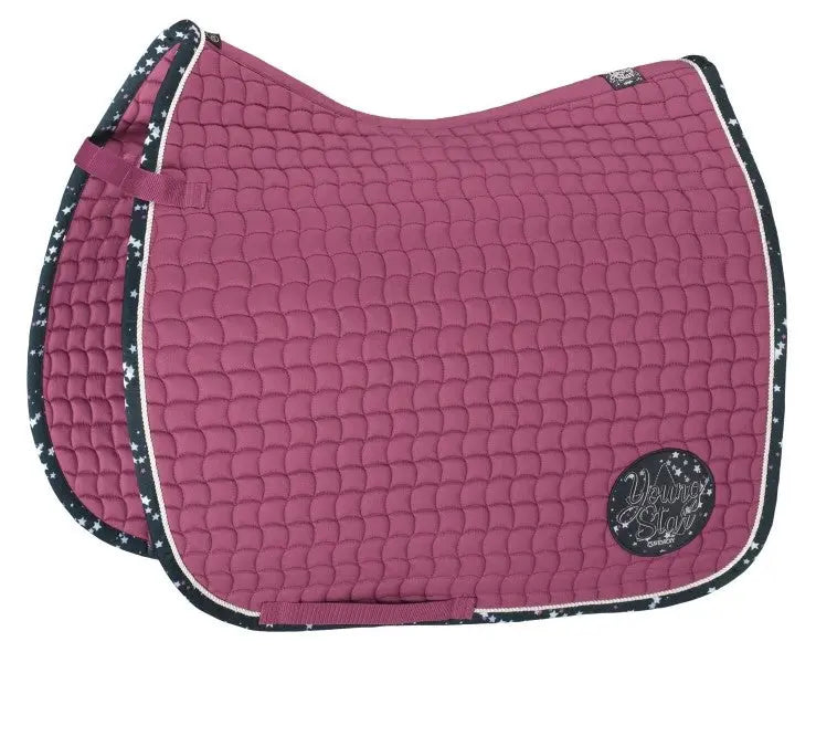 The Eskadron Young Stars Cotton Dressage Square is a pink diamond quilt saddlecloth with a contrast blue star trim and binding.