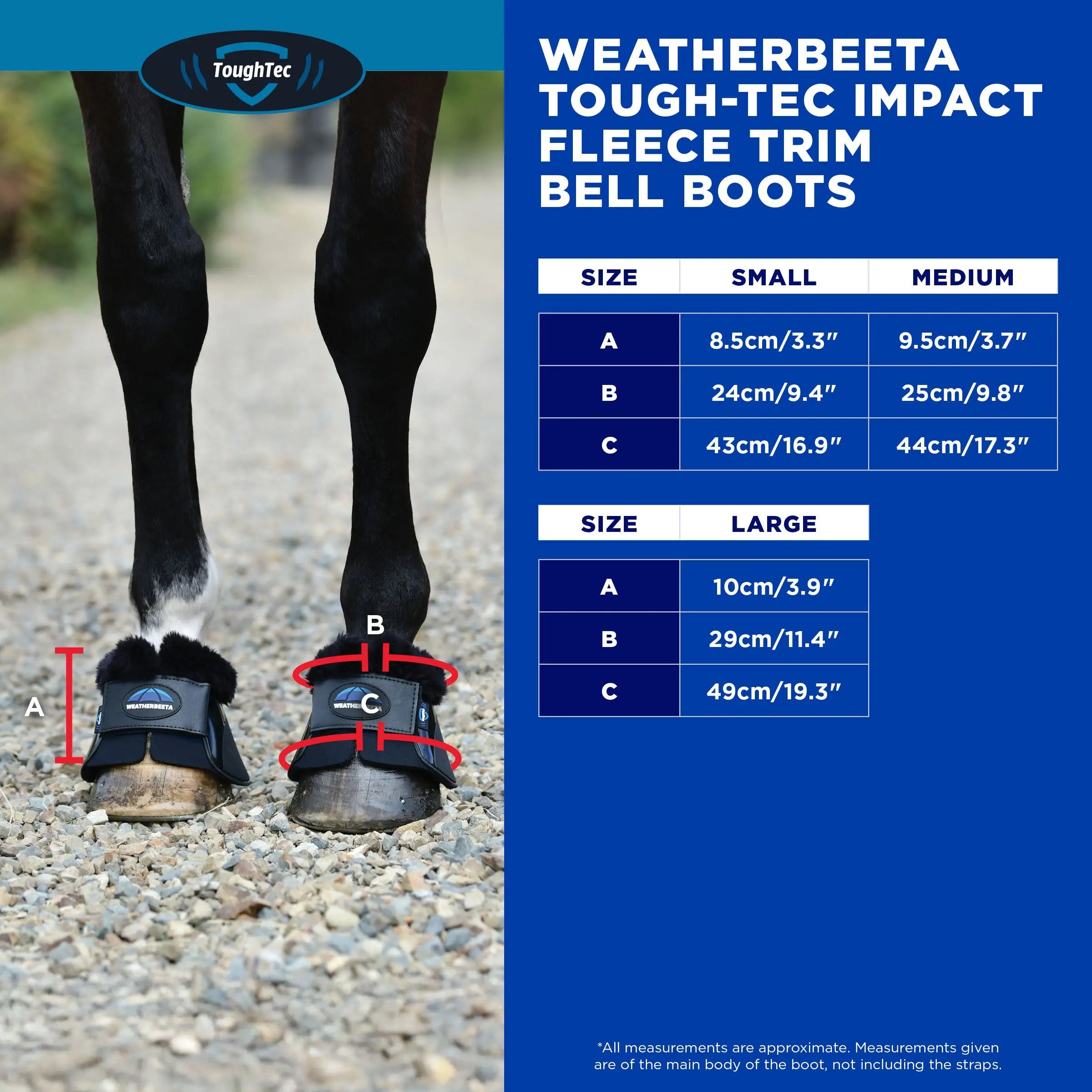 Protect your horse’s hooves with the WeatherBeeta Tough-Tec Impact Fleece Trim Bell Boots. Designed with durability and comfort in mind, these bell boots are perfect for everyday use, whether you're training, competing, or enjoying a leisurely ride. The lightweight yet tough TPU outer layer, paired with a soft neoprene inner, ensures maximum protection without compromising on comfort. The fleece cuff prevents rubbing and adds a touch of extra cushioning, keeping your horse happy from hoof to fetlock. Shaped to fit your horse’s hooves perfectly and featuring a non-twist design, these boots stay reliably in place during every stride. Plus, the quick and easy touch tape closures make putting them on and taking them off a breeze. Ideal for equestrians who demand effective protection and hassle-free functionality.
