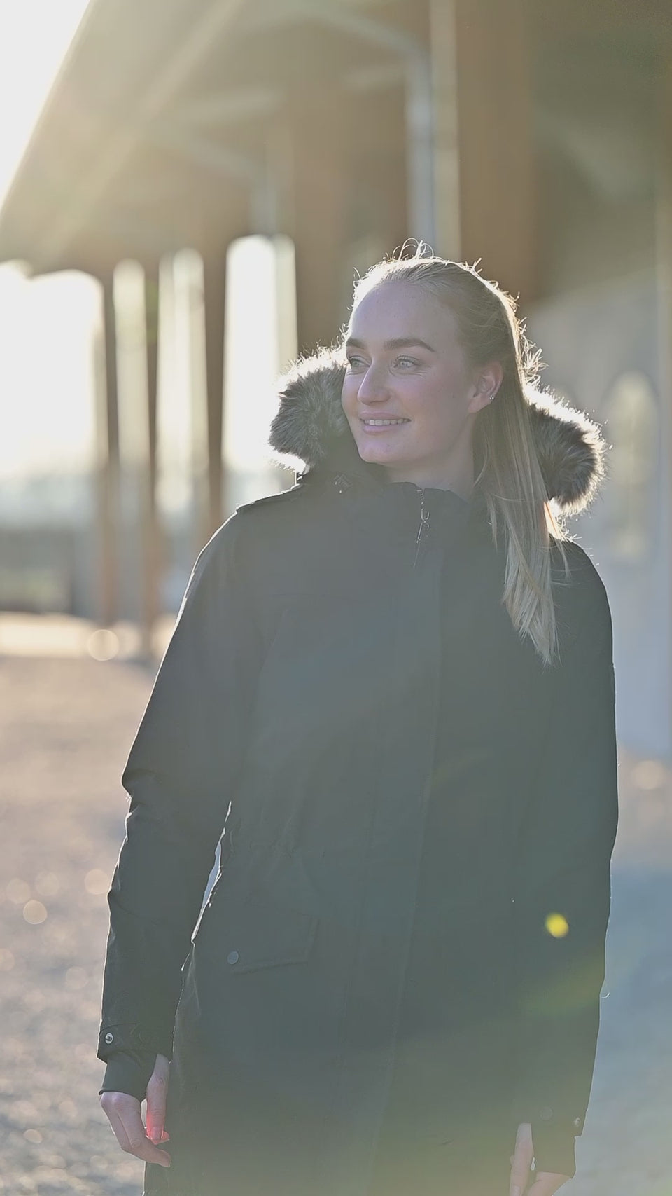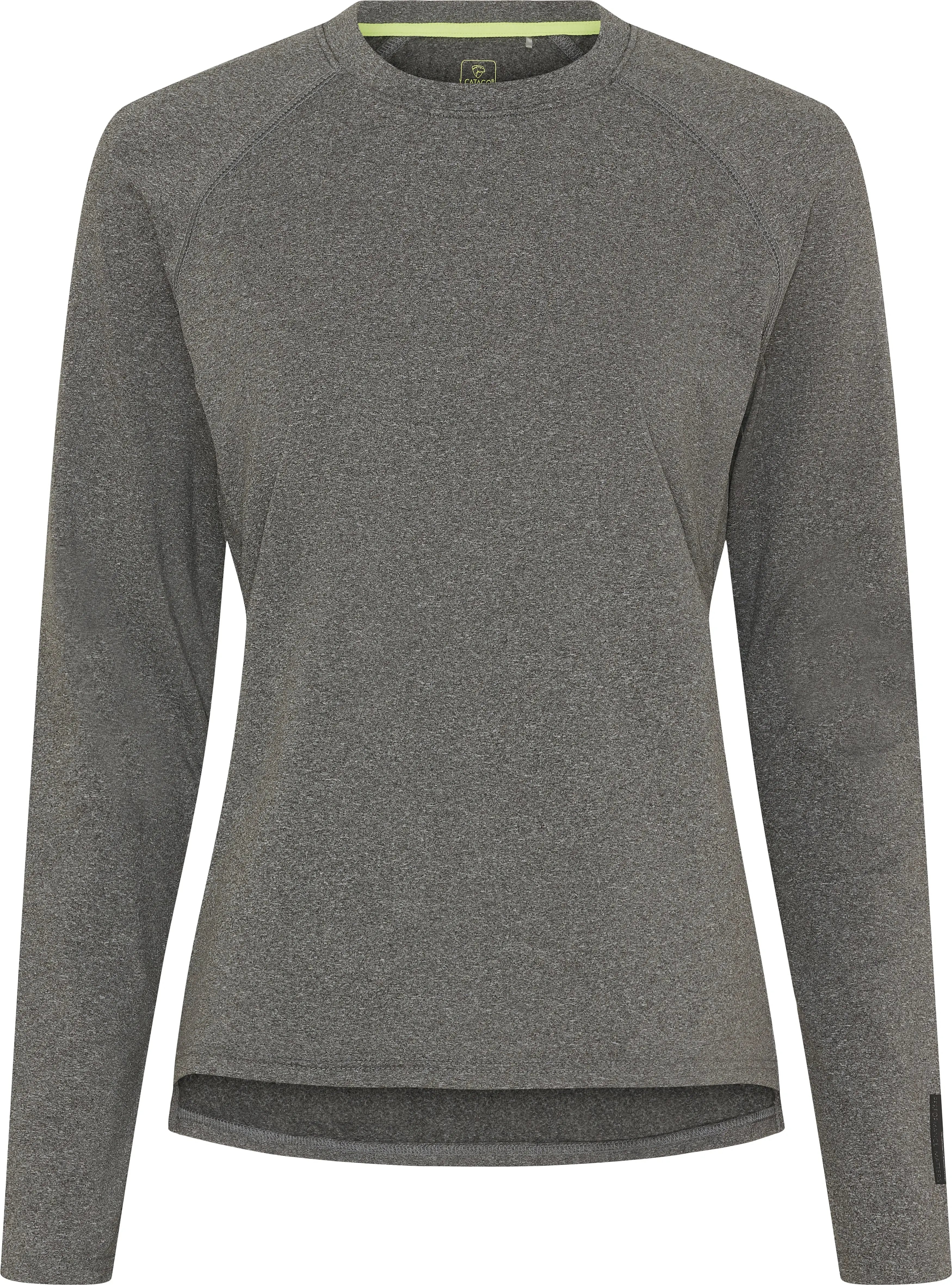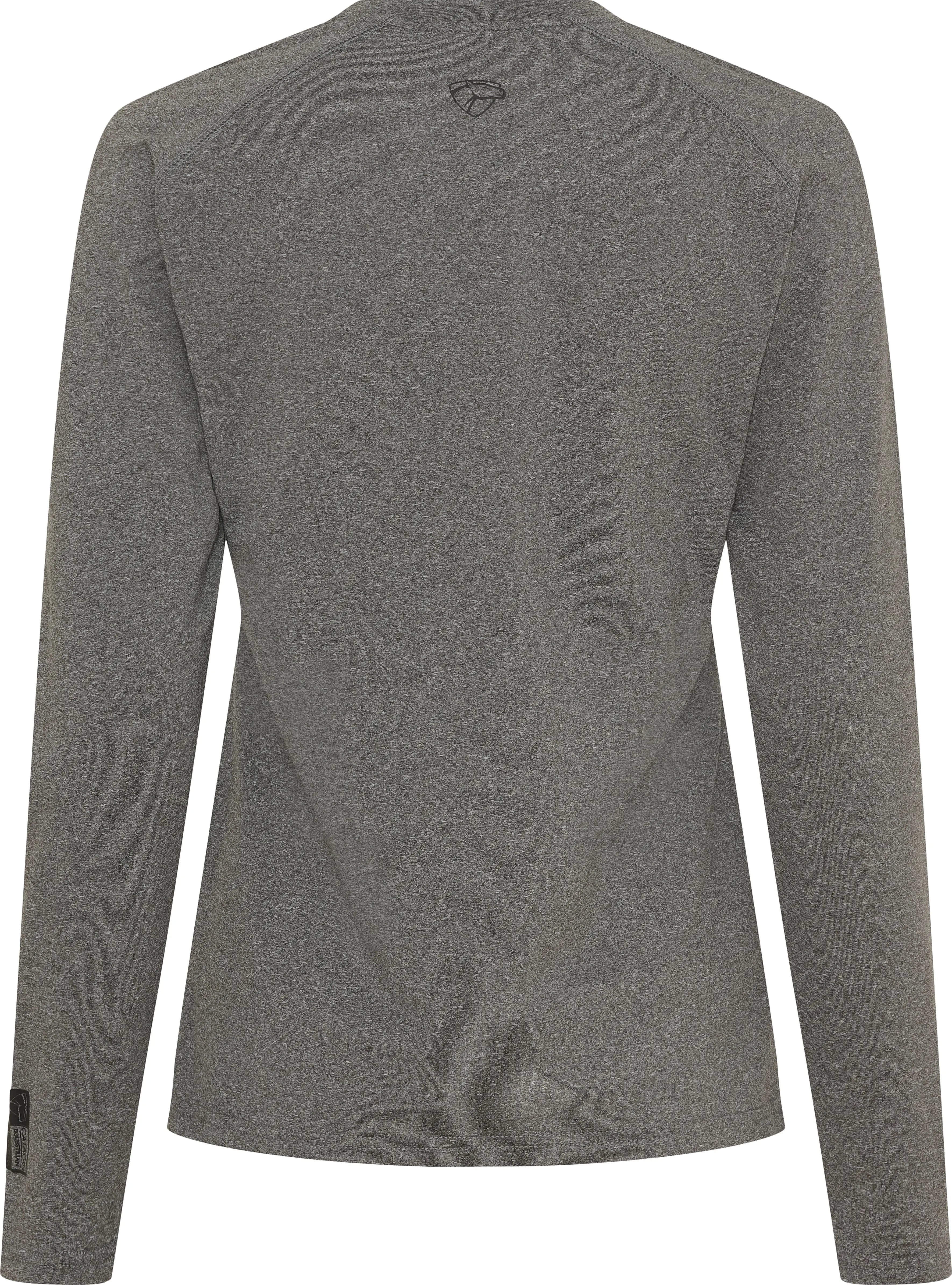 Sporty long sleeve blouse designed from a light weight and stretchy melange jersey with brushed interior. Rounded neck and curved hemline bring some femininity to this otherwise neutral shape. Raglan sleeves and black sleeve logo print complete the sporty look.