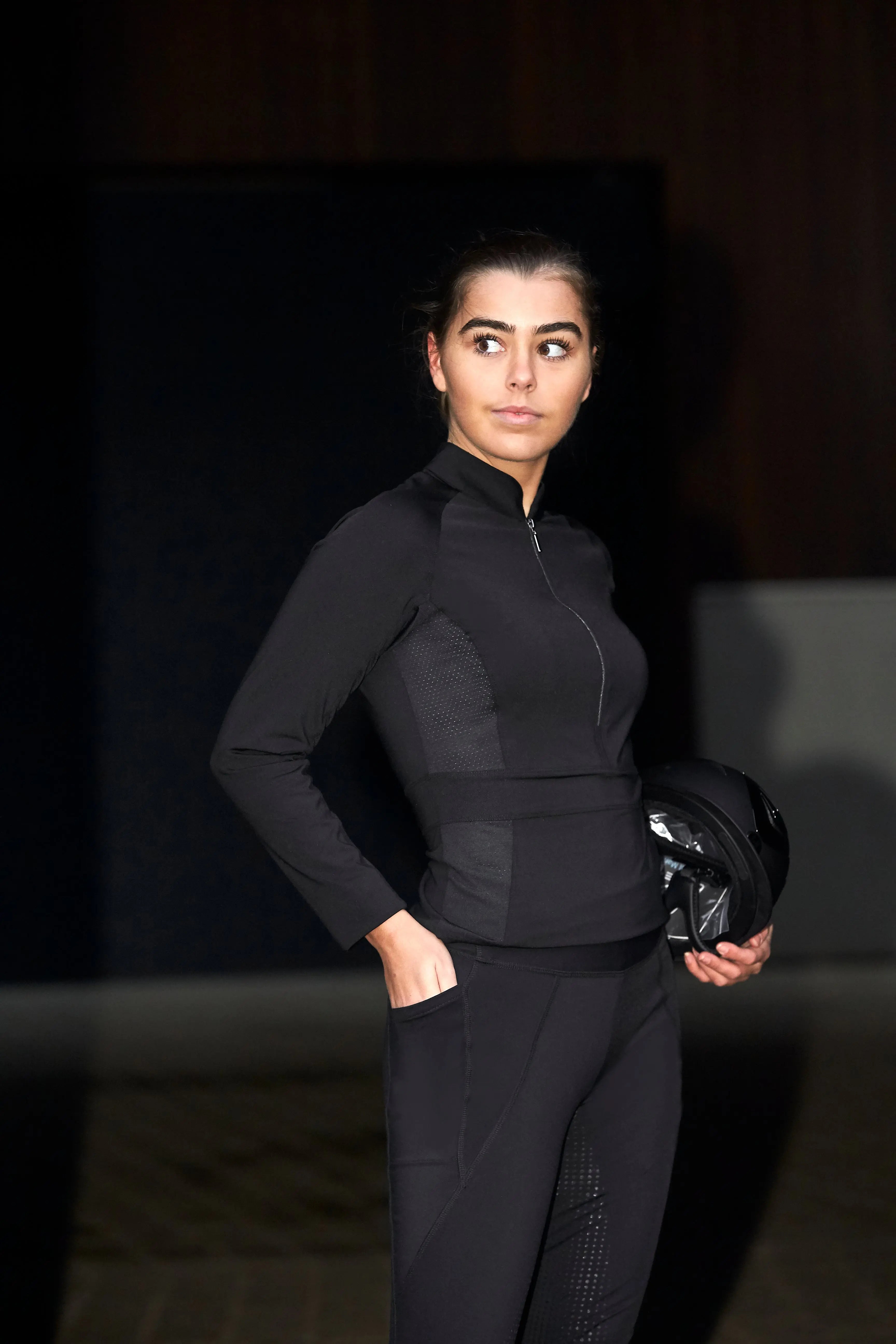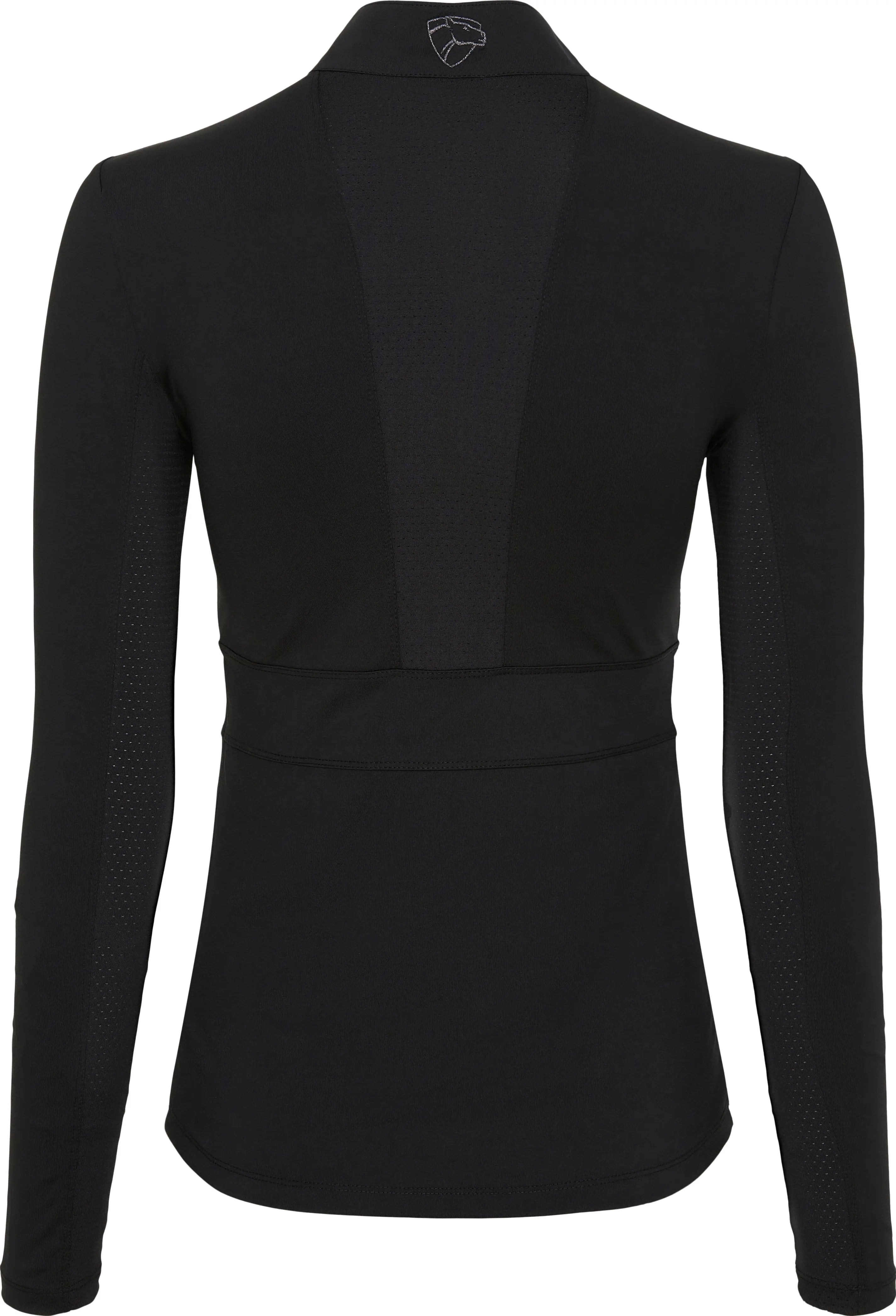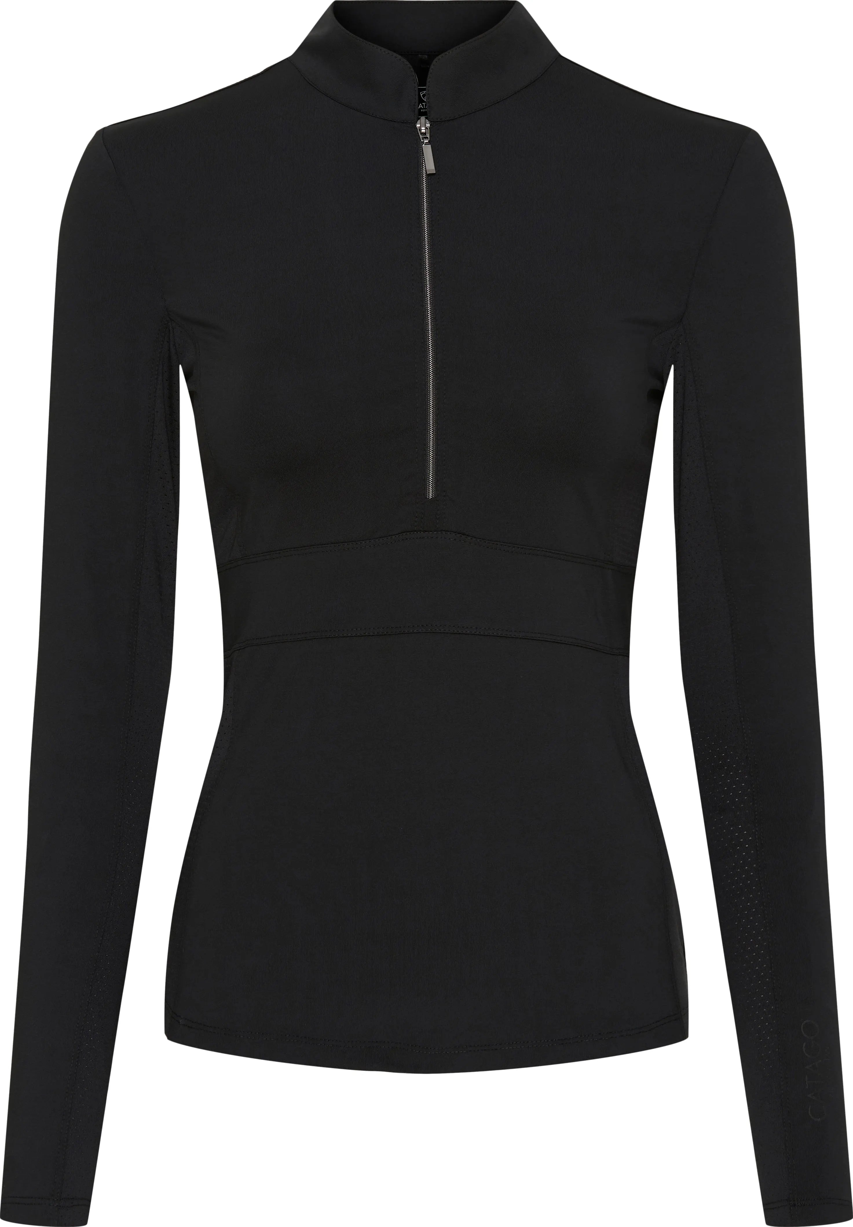 CATAGO Paulina, sporty long sleeved blouse with zipper. The super stretch material offers a perfect feminine, stylish, and tailored fit. The stretch fabric allows greater mobility in any direction making it the perfect clothing for riding and other sports. Easy to combine and a must have for every equestrian wardrobe. The CATAGO logo is nicely placed on the left sleeve.