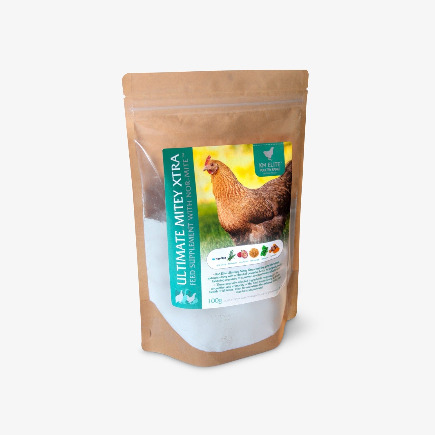 KM Elite Ultimate Mitey Powder contains aromatic plant extracts of clove & lemongrass, along with a blend of powerful herbs to support poultry following exposure to common environmental challenges. These specially selected ingredients help support the circulation and immunity of the bird, maintaining optimum health. Ideal for use where the external living area may be compromised.
