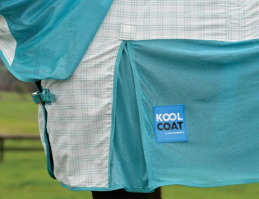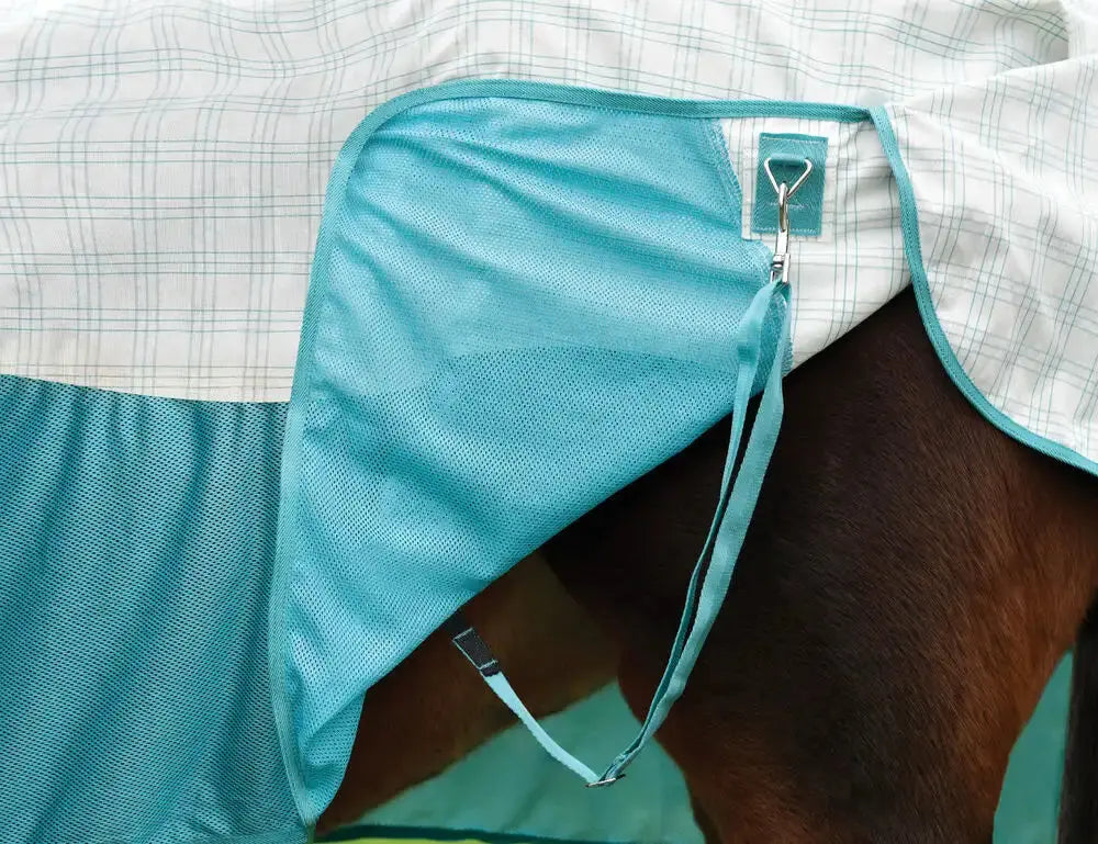 The breathable and cool summer sheet with mesh paneling is the Kool Coat Cotton Airstream II Detach-A-Neck horse sheet, a perfect alternative to a traditional mesh fly rug that protects your horse from flies and midges as well as harmful UV rays. This Kool Coat with a 240g upper section with a 40% cotton content for breathability offers 90%+ UV protection (excluding mesh areas) and is designed to aid with cooling featuring polyester mesh lower panels. Lined shoulders, mane and tail areas prevent rubbing. twin web adjustable buckle front closure for a comfortable fit. Traditional side gussets offer natural movement and a generous tail flap enhancing protection. Web adjustable and removable leg straps and adjustable hidden surcingle. Detachable neck portion with ski clip neck closures offers versatility.