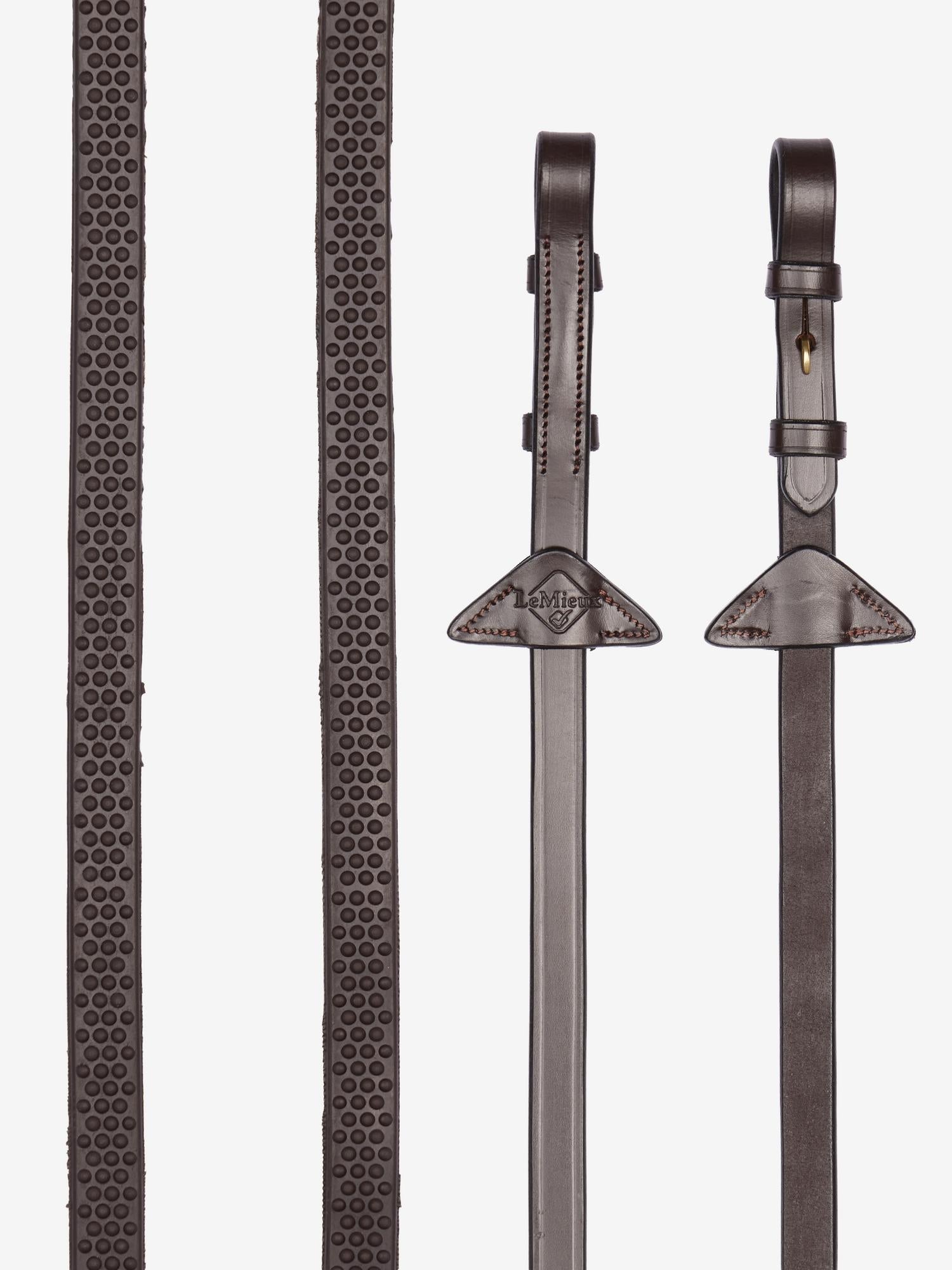 The LeMieux Soft Rubber Reins are beautifully soft and flexible reins that have a light feel in the riders' hands. With raised pimple texture for additional grip and nylon lining to prevent stretching. On Havana and Chestnut colourways, the rubber colour is Brown.