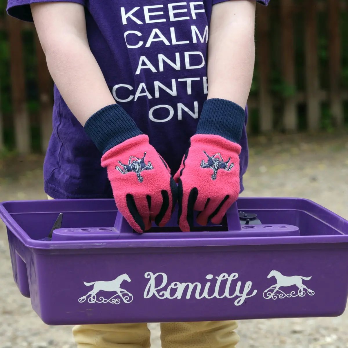 Children's riding gloves with a fleece back and an amara palm, to match our Shetland half chaps. The gloves are available in a range of pretty colours, to match the Shetland chaps.