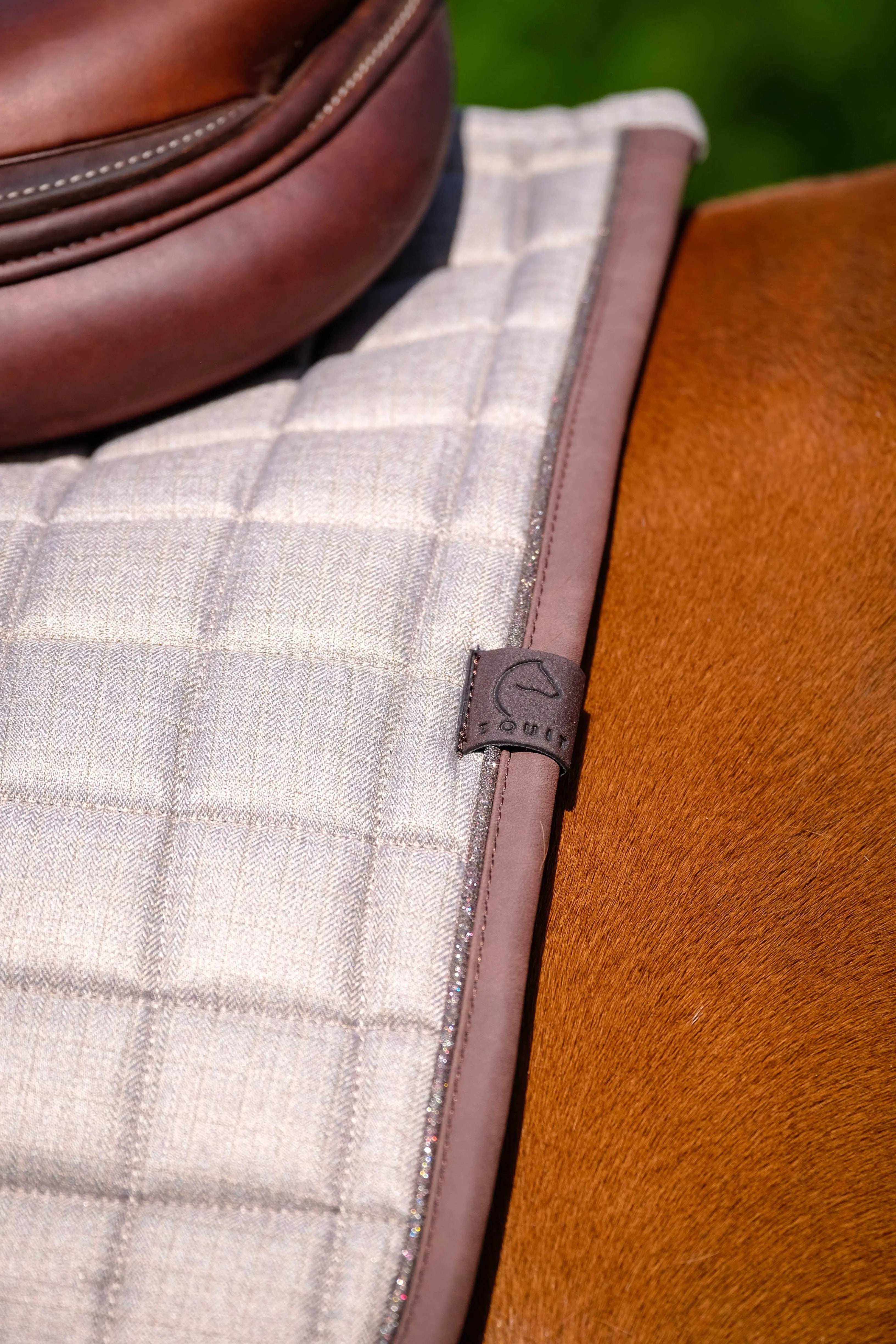 A chic and elegant Khadi fabric in all circumstances. - Breathable: Coolmax lined, quick drying. - Comfort: 200 g Polyfil and 8 mm foam. - Elegant: Exterior braid in imitation leather with glittery edging. DETAILS: - Square quilting and strap loops. - EQUITHÈME logo on imitation leather patch.