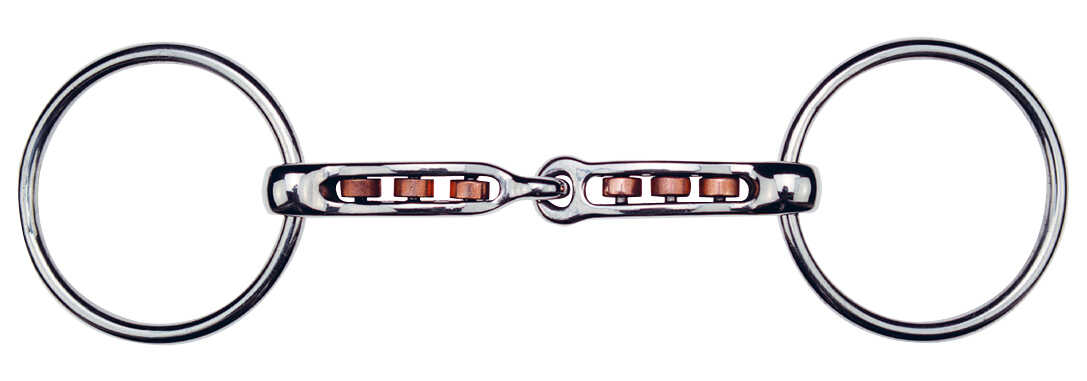 Stainless steel with relaxing copper rollers. The raw edges of the barrels encourage horses not to lean too hard. Should be used with a gentle hand.