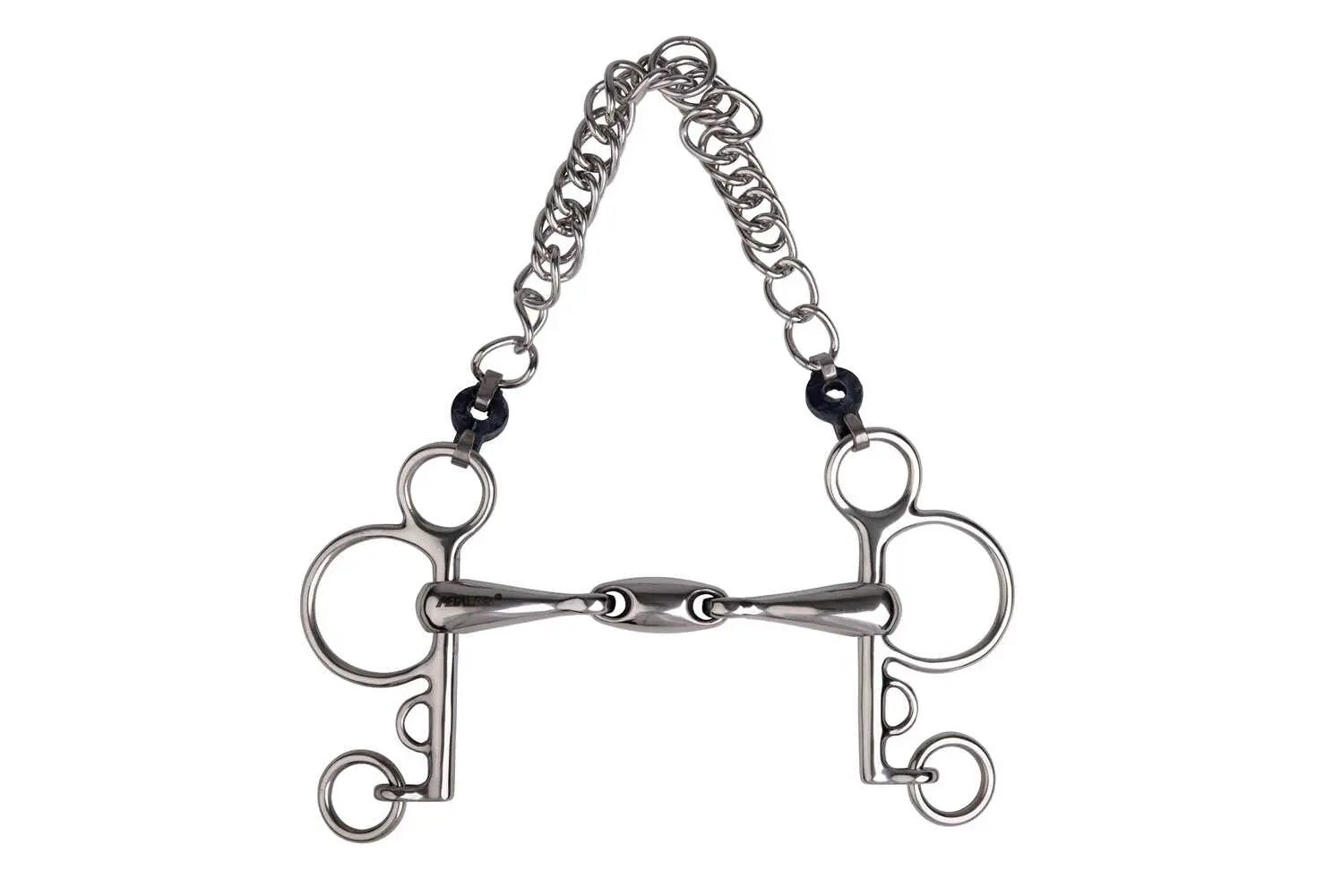 In stainless steel, solid snaffle, double jointed with oval link, sliding branches.