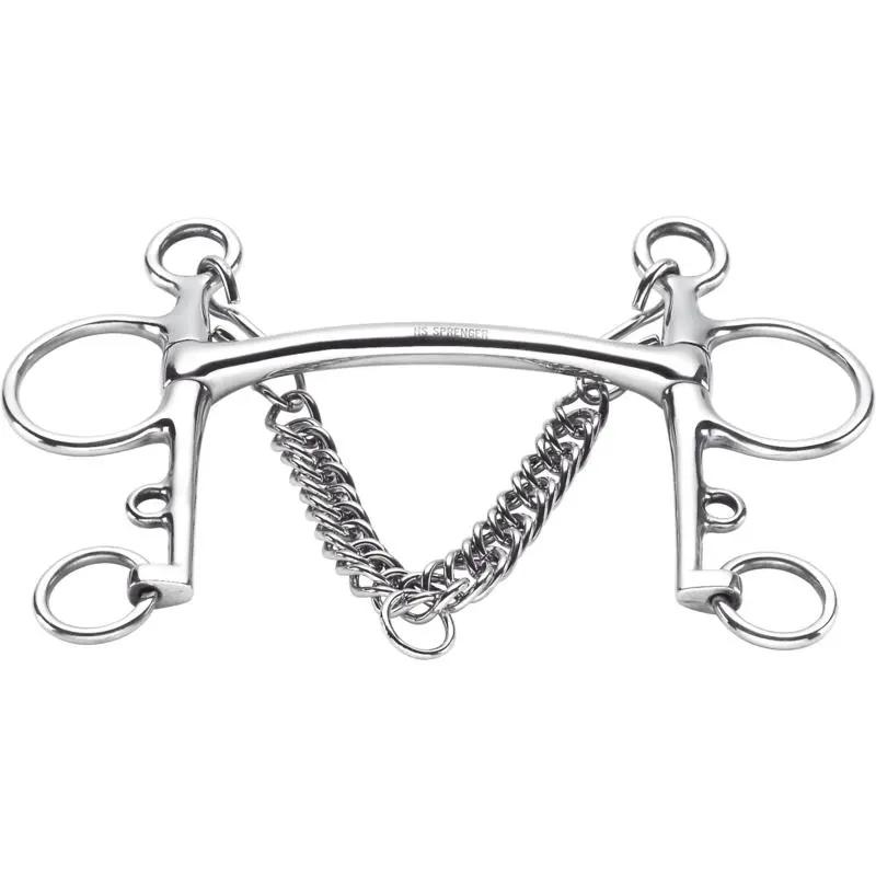 The Pelham is a bit that provides additional lever action on the poll. Pressure is applied to the lower jaw bones by the use of a curb chain. Pelhams can be used with one or two reins, which enables different rein options. Direct pressure is applied to the horse's tongue and bars if the rider only uses the snaffle rein.