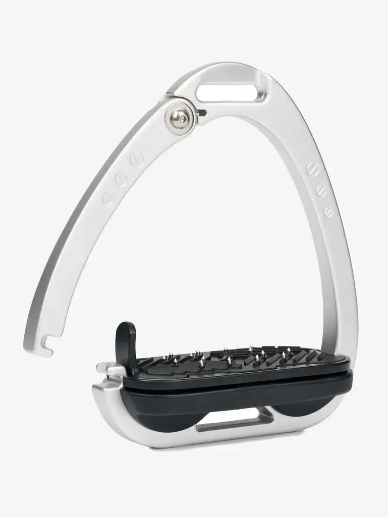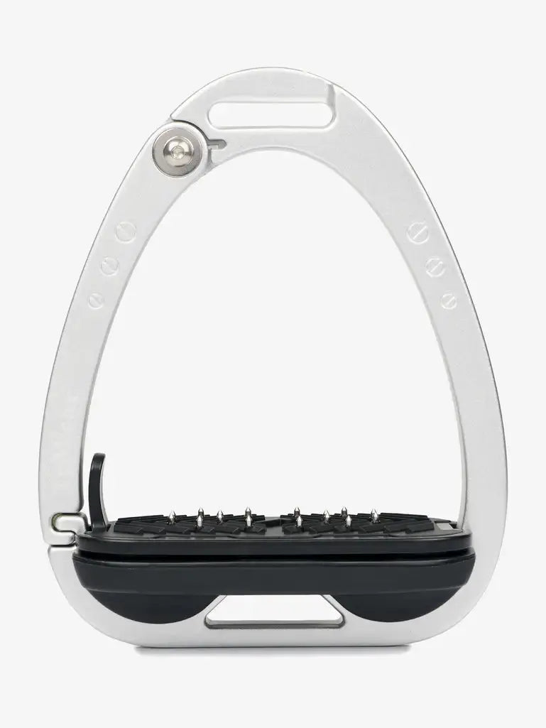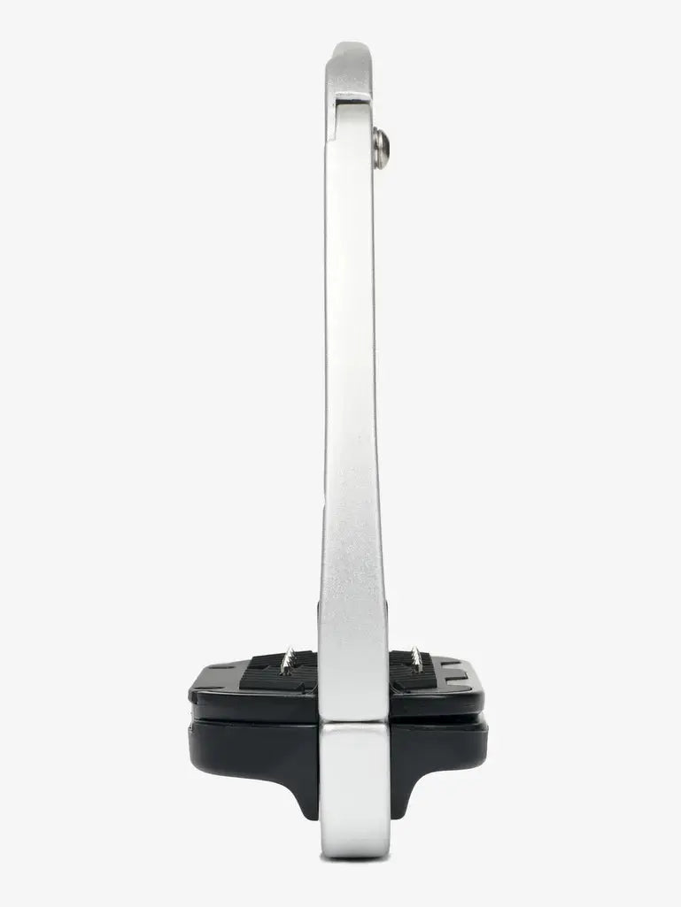 The footplate is supported by a twin balance arch system which distributes weight evenly across the base of the stirrup frame. The frame's apex is recessed and off-set, encouraging a 45° outward orientation which allows the rider to more easily locate the optimum angle for the foot and regain a lost stirrup.