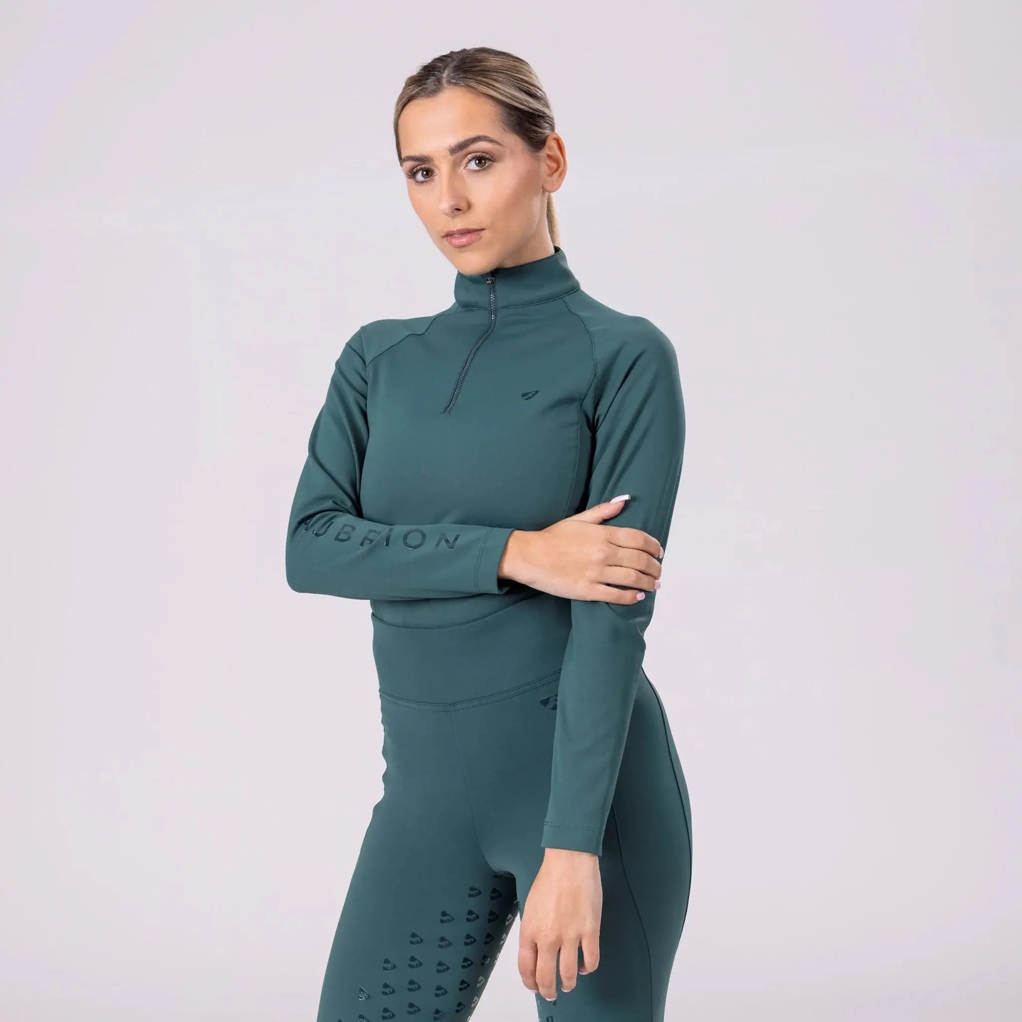 Offering year-round versatility, the Aubrion Eltar base layer offers a wicking next-to-skin layer with all round stretch. Ideal for general use and as part of a layering system. The 1/4 zip highline neck allows for optimal ventilation and versatile wear to regulate your comfort. Eltar brings essential performance to your riding along with coordinated looks for you and your horse. Key features: moisture wicking, quick drying, breathable, smooth feel, long sleeves, 1/4 zip at neck, comfort seams, self-colour Aubrion silicone prints.