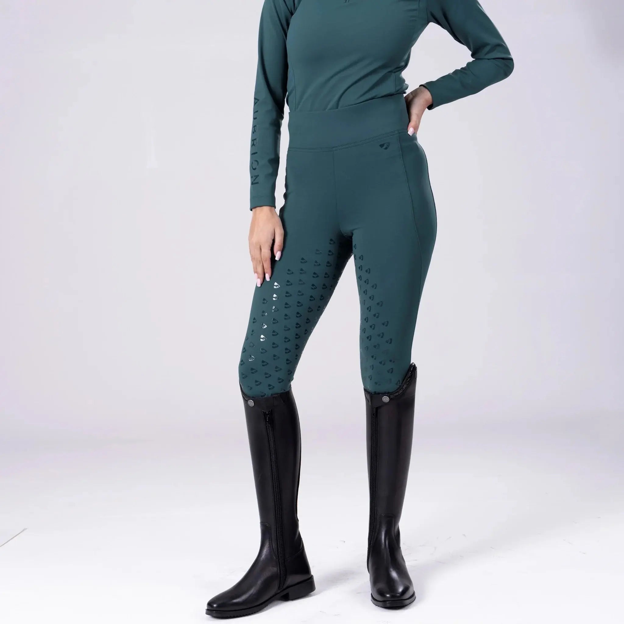 Created for a light, comfort fit that feels secure without being restrictive, the Aubrion Eltar riding tights support the rider, offering a wicking next-to-skin layer with all round stretch. Full silicone grips keep the rider secure in the saddle and protect against rubs. the lower leg is shaped to flatter and to avoid ride up. A deep, high-rise waistband offers full coverage and a side drop-in pocket holds a mobile phone securely. Eltar brings essential performance to your riding along with coordinated looks for you and your horse. Key features: moisture wicking, quick drying, breathable, smooth feel, full silicone grips, thigh phone pocket, comfort seams, self-colour Aubrion silicone prints.