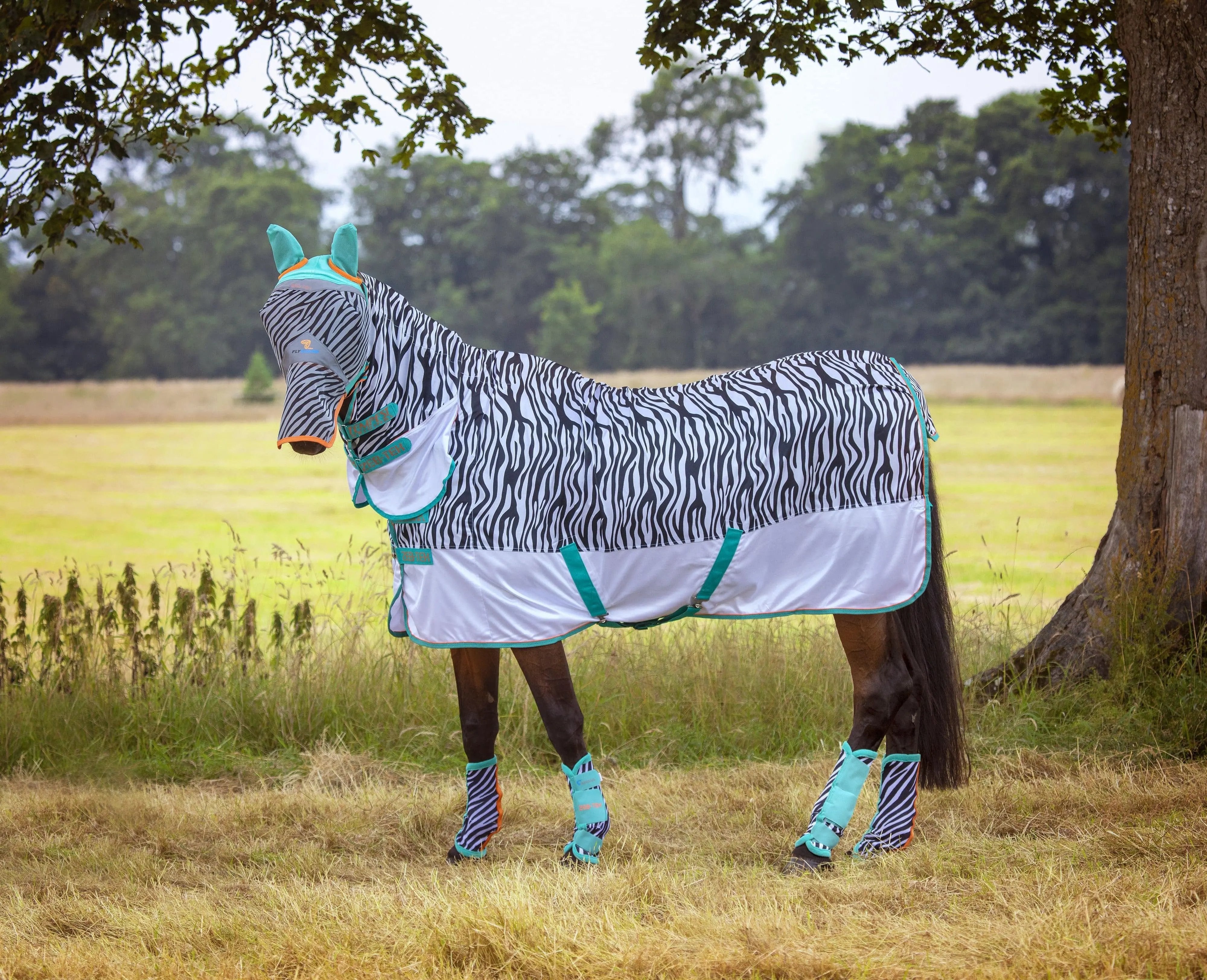 A highly affordable, breathable fly rug with zebra print to reduce the number of landing flies. This fly rug features a built in neck cover and UV reflective properties to prevent coat bleaching and overheating.