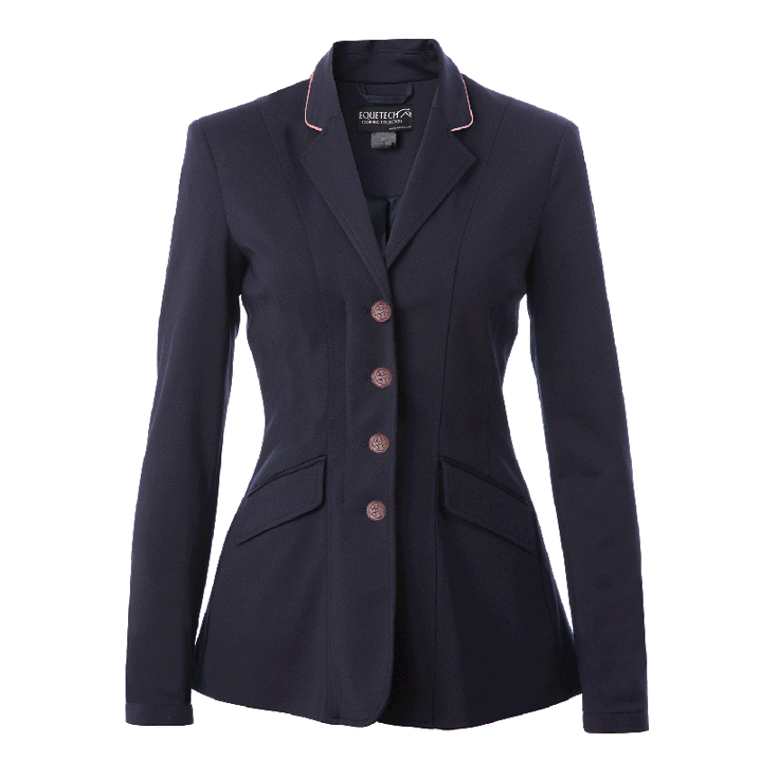 Classical tailored competition jacket with modern elements. Made from durable knitted ponte fabric with 5% Lycra added stretch and shape retention. Other features include fancy metallic piping to collar, Equetech exclusive crystal button, double back vents, darted contoured sleeves and concealed zip pockets. Machine washable.