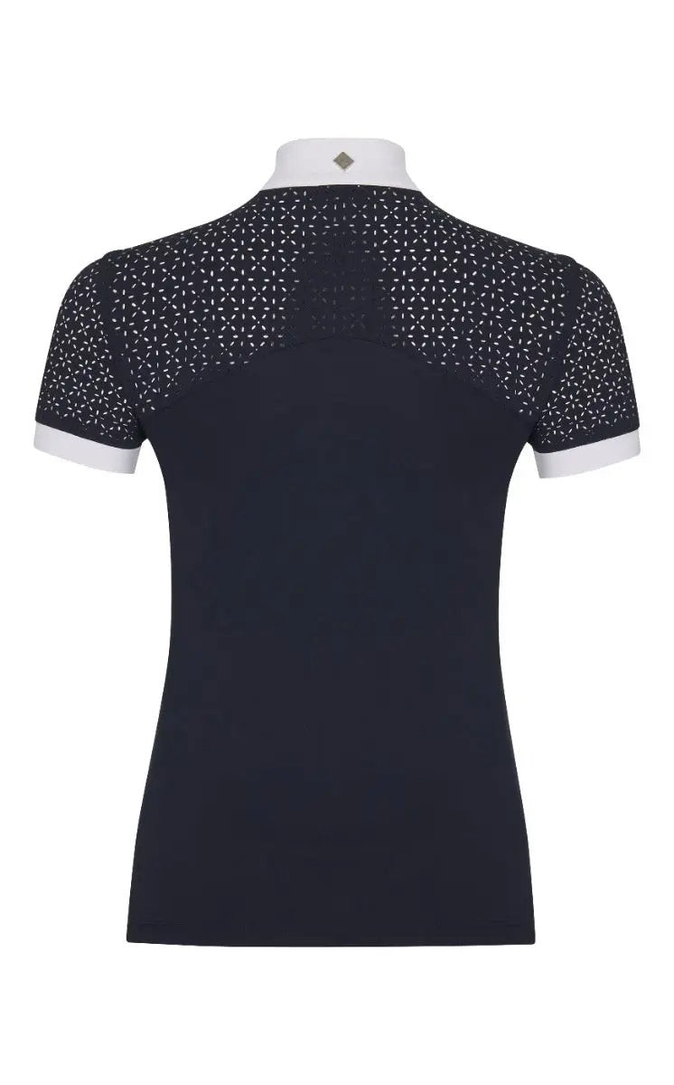 Designed with beautiful detailing, this elegant show shirt is comfortable to wear beneath your show jacket and gives that special feel for confidence when you need it. It features a white collar and cuffs, with laser-cut lace short sleeves and back yoke panel for pretty detailing and a cool, breathable feel. Subtle diamante detailing, invisible zip front closure and snap button cuffs add to the look.