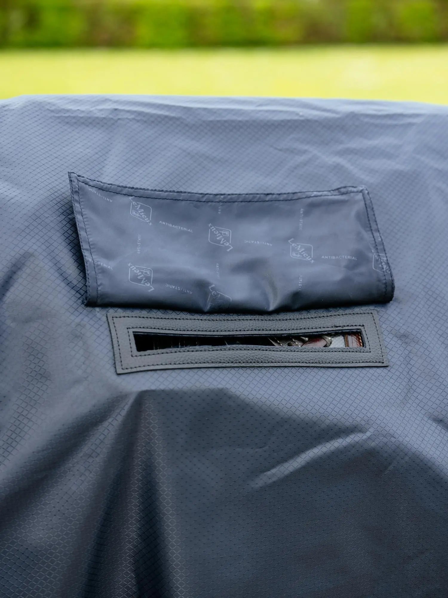 The generous silhouette, single surcingle and stirrup slits mean it fits neatly over tack, protecting both your leatherwork and your horse.