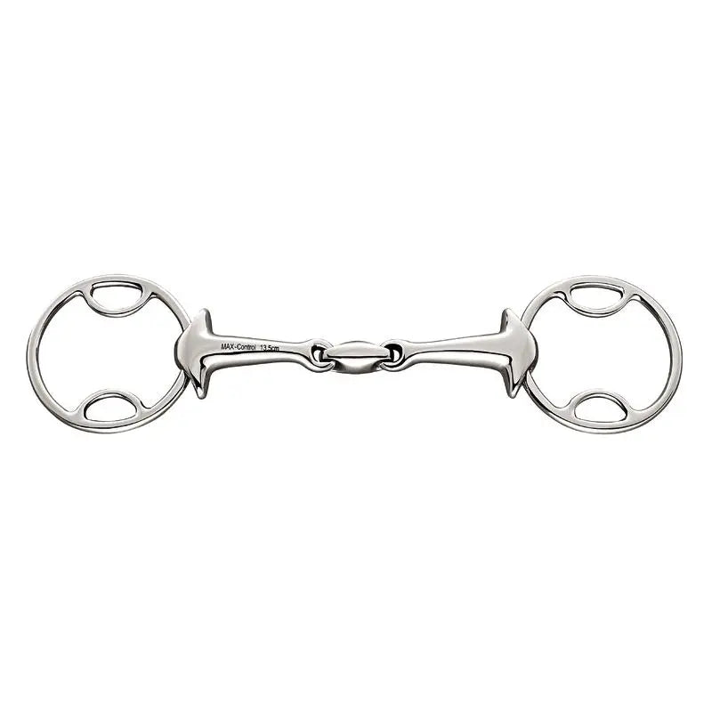 The MAX-Control is a double-jointed bit which, at a first glance, cannot be distinguished from other double-jointed loose ring snaffles. However, it is a correction or training bit which locks at a certain angle and thus becomes a straight bar. The bit lies very well in the mouth when the horse is working properly. When the horse opposes the rider's hand the more intensive rigid effect occurs.