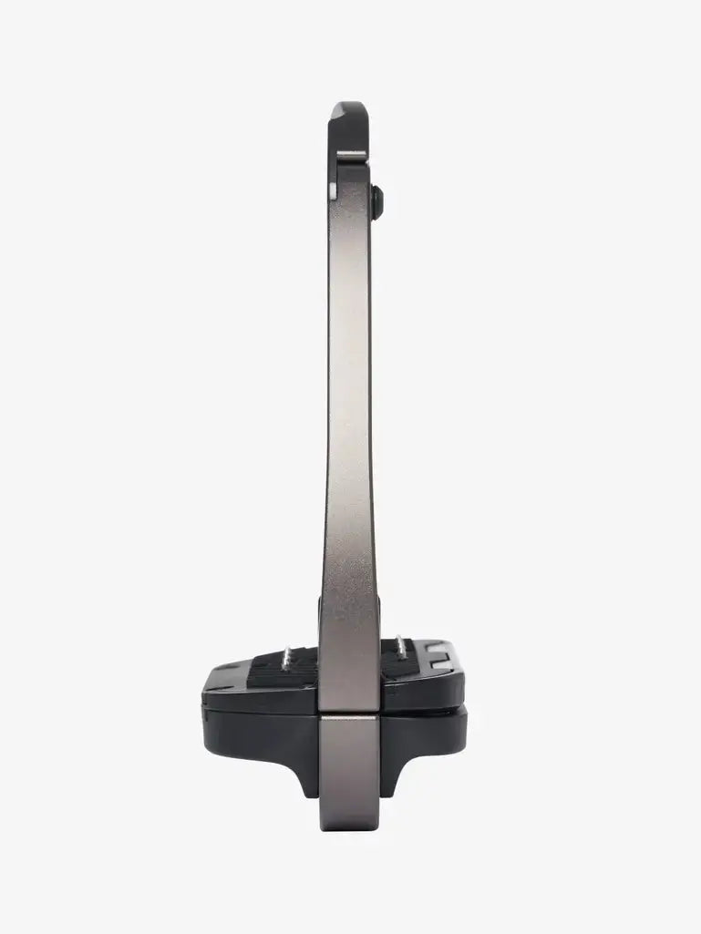 The ergonomic footplate of the Balance Stirrup is set at 5°, featuring a cross-track grip surface with embedded hardened steel pins, to enable lower leg stability, keeping the heels down.