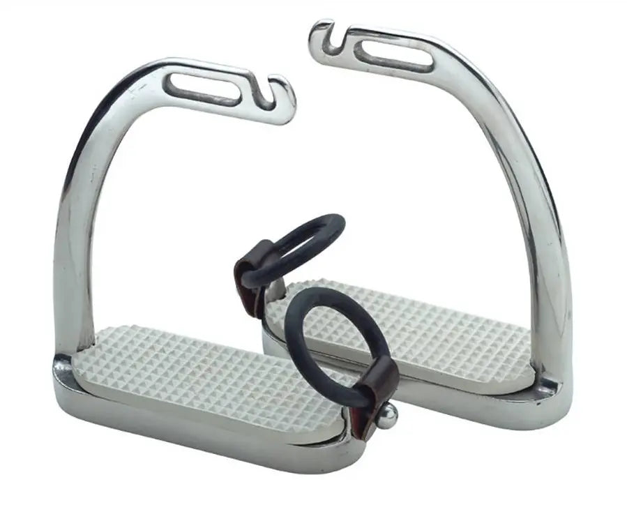 Peacocksafety stirrups are specially designed for novice riders and children for improved safety but they are also used by experienced riders bringing on young horses. In the unfortunate event of an accident, your foot will not get trapped in the stirrup iron as the rubber band detaches easily when pressure is applied. This helps to prevent the foot from becoming lodged in the stirrup, preventing the rider from getting dragged.