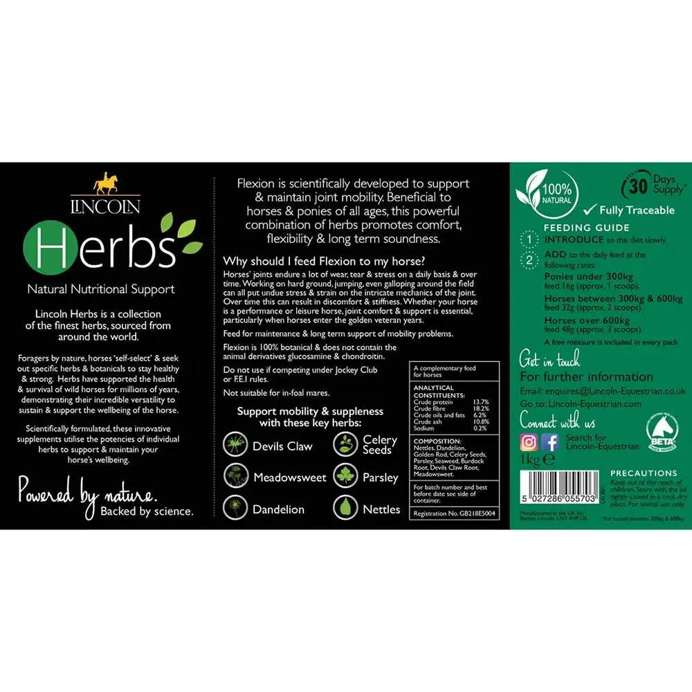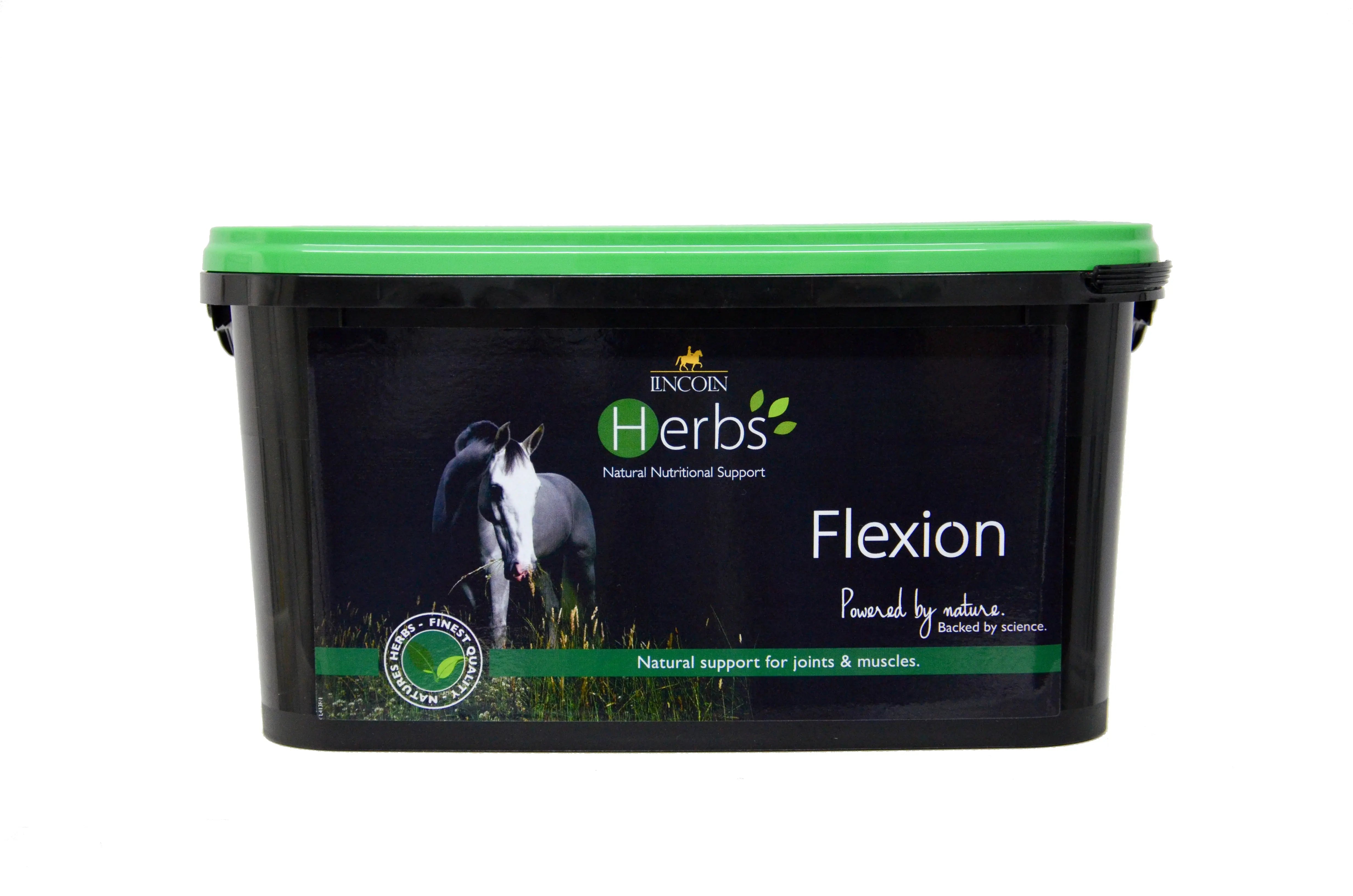 A natural herbal supplement, scientifically formulated to support & maintain joint mobility. Flexion optimises the natural properties of this unique combination of herbs to maintain healthy joints in horses & ponies of all ages, promoting comfort, flexibility & long term soundness. This powerful combination also helps to cleanse & detoxify, supporting natural recovery from stress & damage. 100% botanical, Flexion does not contain the animal derivatives Glucosamine or Chondroitin. Not suitable if competing under F.E.I. or B.H.A. rules.