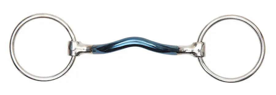 The Shires Blue Sweet Iron Loose Ring Mullen Mouth Snaffle gives a stable feel in the horse's mouth for security and consistency. It features a medium port, creating space for the tongue and offering pressure relief. A ported mouthpiece is often preferable to horses who are adverse to tongue pressure. The loose ring design allows the mouthpiece to move within the mouth to promote self carriage and discourage fixing or leaning.