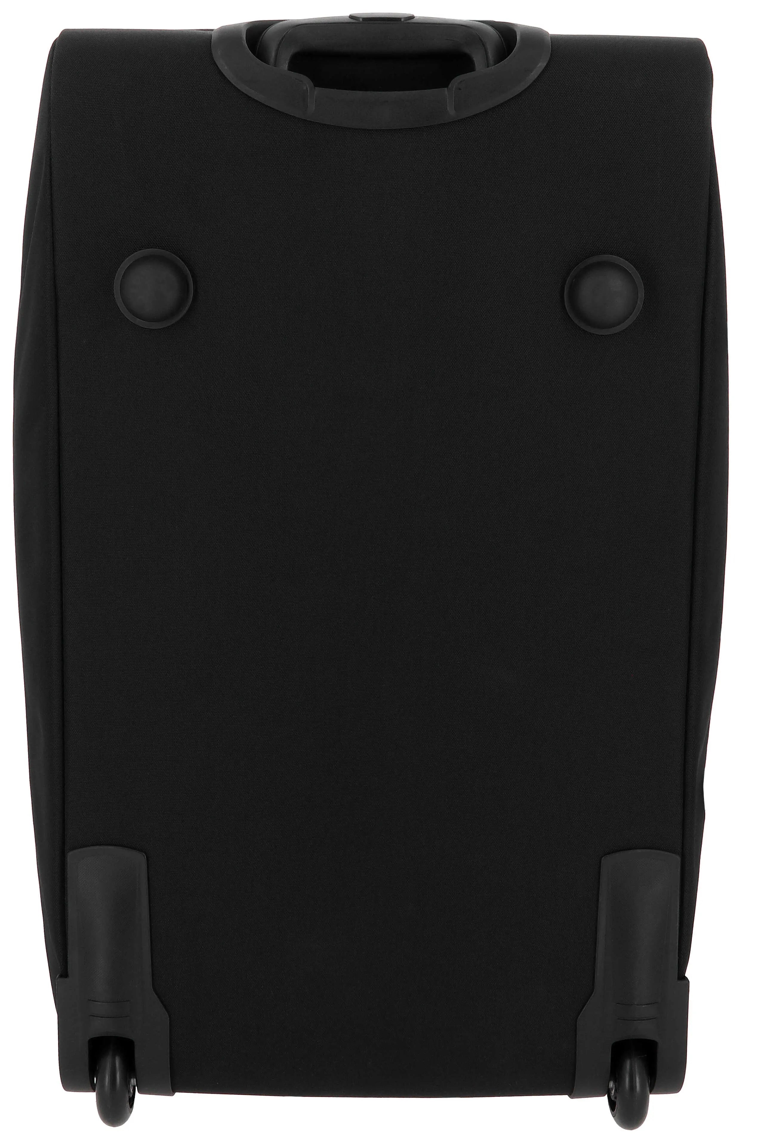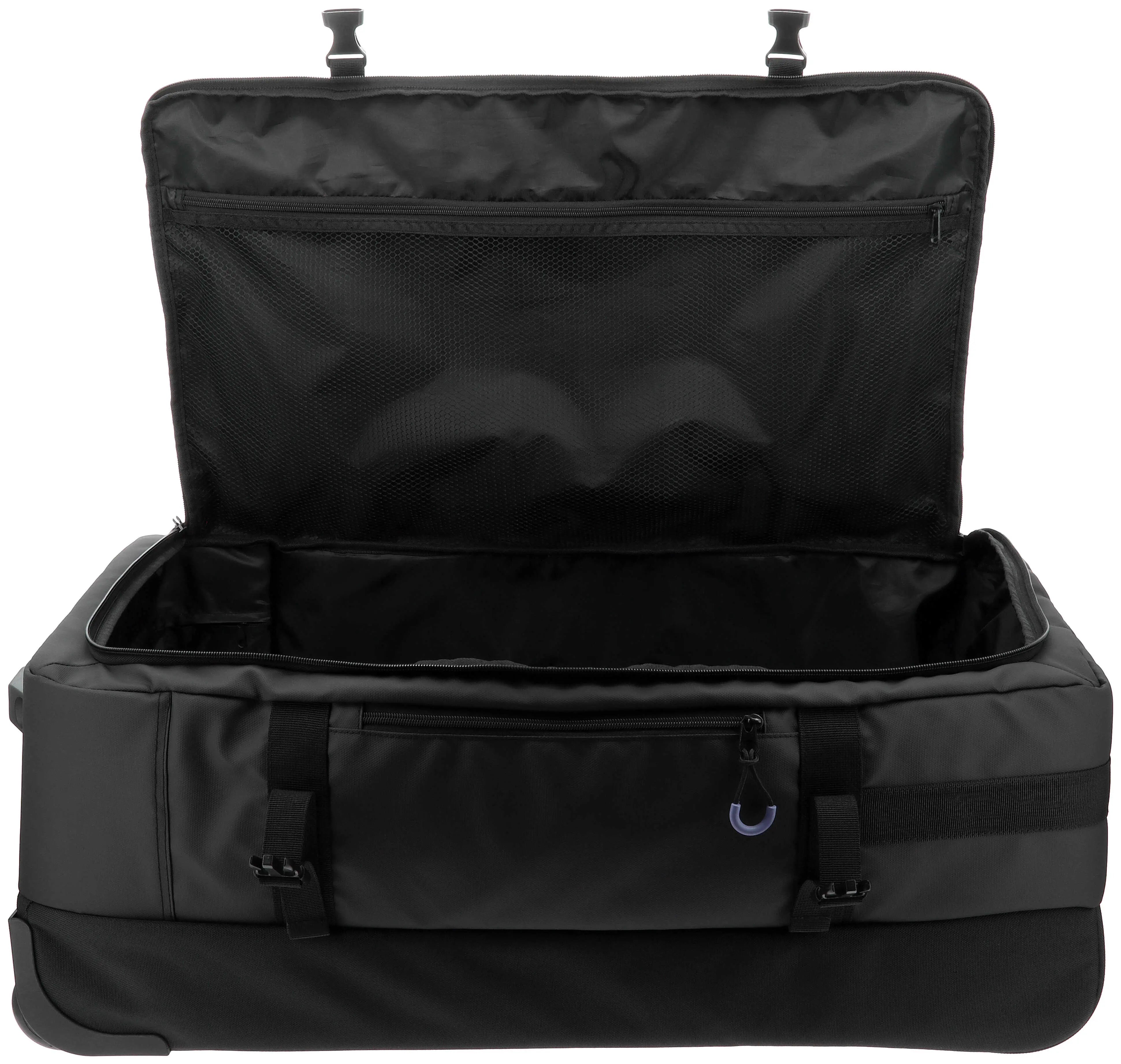 Rolling travel bag! - Large capacity: Generous space for all your travel essentials. - Compartments: A large main pocket with compression straps, zippered pockets, and an exterior pocket for quick access. DETAILS: - Lilac zipper finishes on the black bag, and black on the lilac with Equithème black logo. - Reinforced base for stability and shock protection, with a side and top handle. - Adjustable telescopic handle for ergonomic transport.