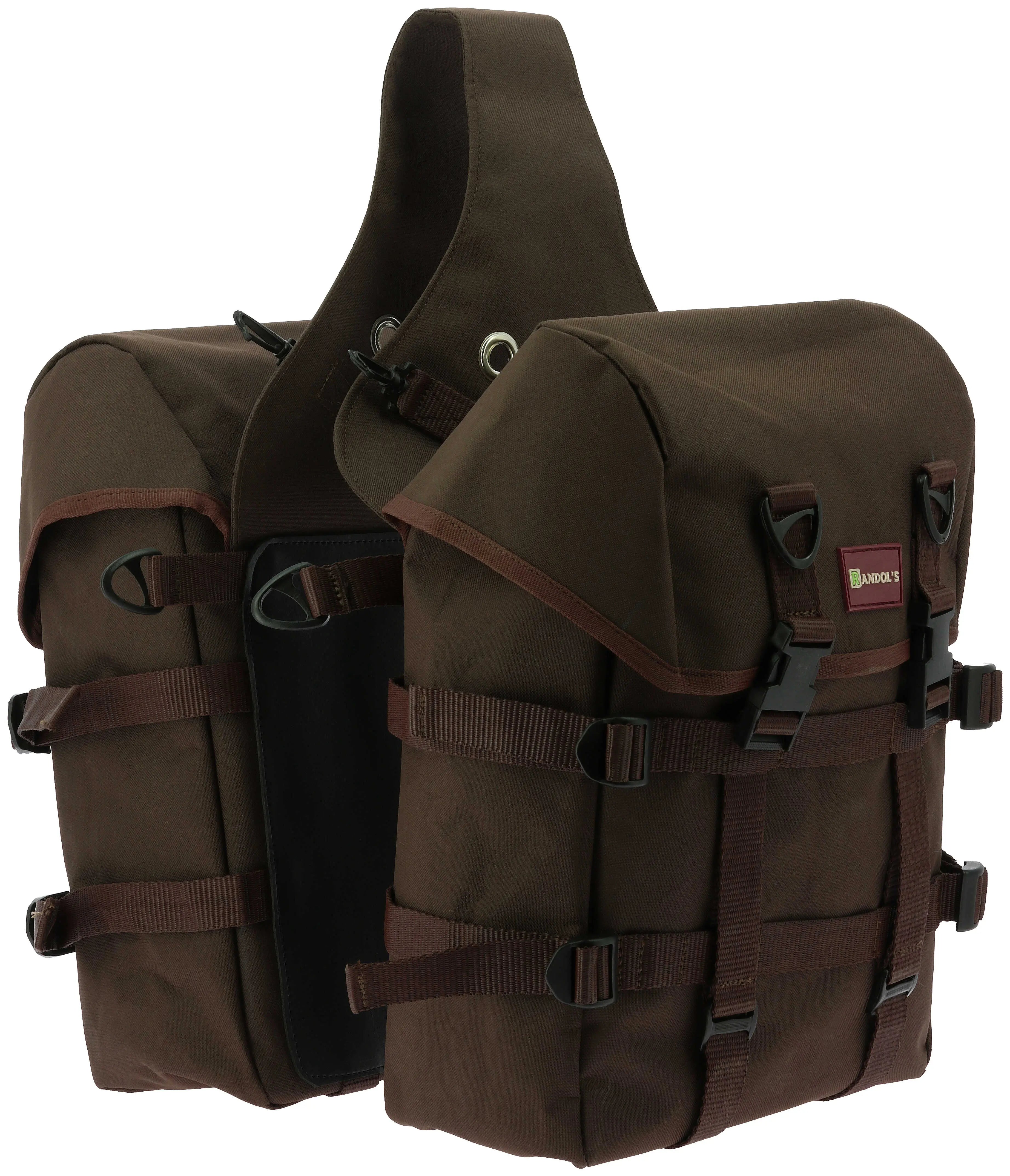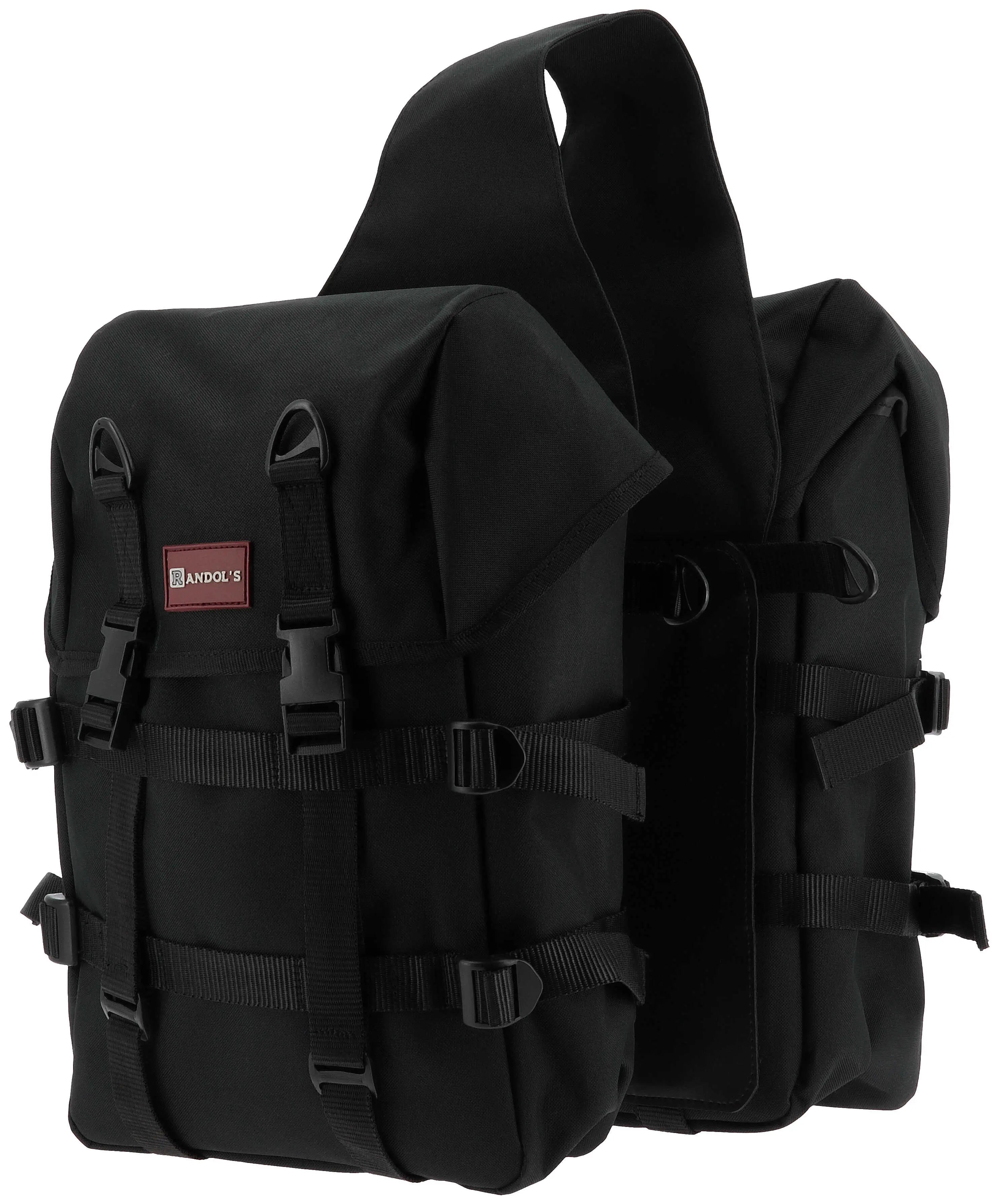 Large double bag with PVC. - Spacious and waterproof: Made from 600D coated polyester. - Practical and functional: Drawstring closures for quick access, with small flaps for added protection. DETAILS: - Hard PVC inserts and a soft PVC plate at the back reinforce the bag's structure. - Attachment with eyelets, carabiners, and straps.