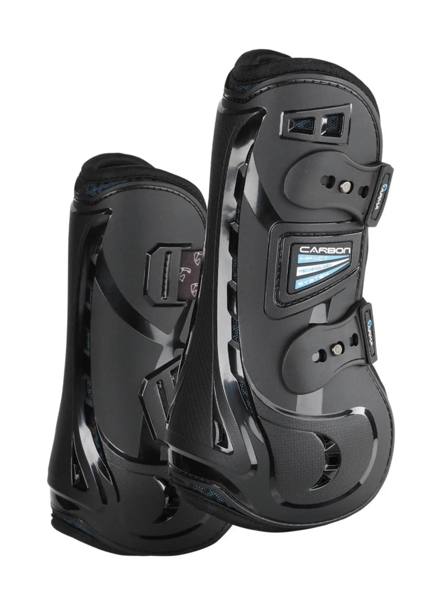 ARMA Carbon open fronted tendon boots are shock absorbing and offer next level protection in the most vulnerable areas whilst still allowing the horse to feel their way. TRIPLE IMPACT SUPPORT SYSTEM: Strong TPU outer, resistant to abrasion and dirt. Honeycomb foam centre absorbs impacts. Breathable COOLMAX lining engineered to keep hardworking legs cool and dry. MAX VENTILATION: Strategically placed mesh vents increase airflow around the tendons, reducing heat build up and maximising ventilation. FLEX FIT: The ergonomically shaped TPU shell defends against impact yet the flexible structure moves with the horse to facilitate peak athleticism. Elasticated straps with pin fastening for a secure, quick fit.