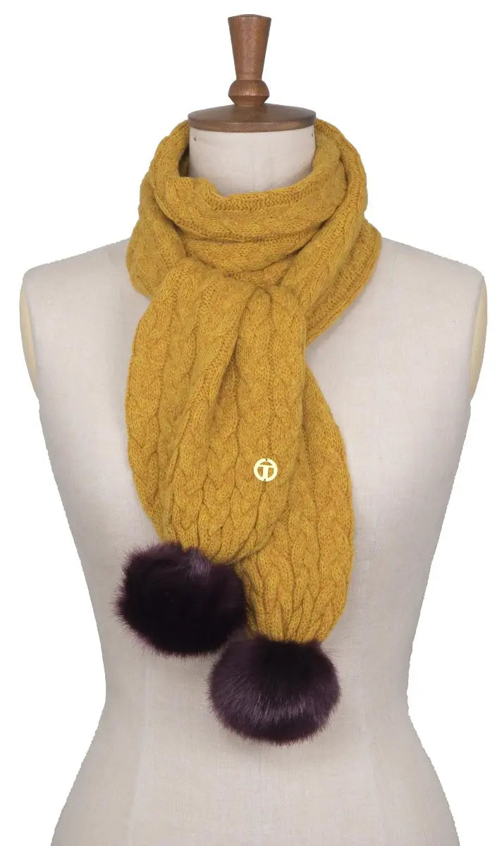 This stylish knitted scarf features faux fur pom poms on the ends.