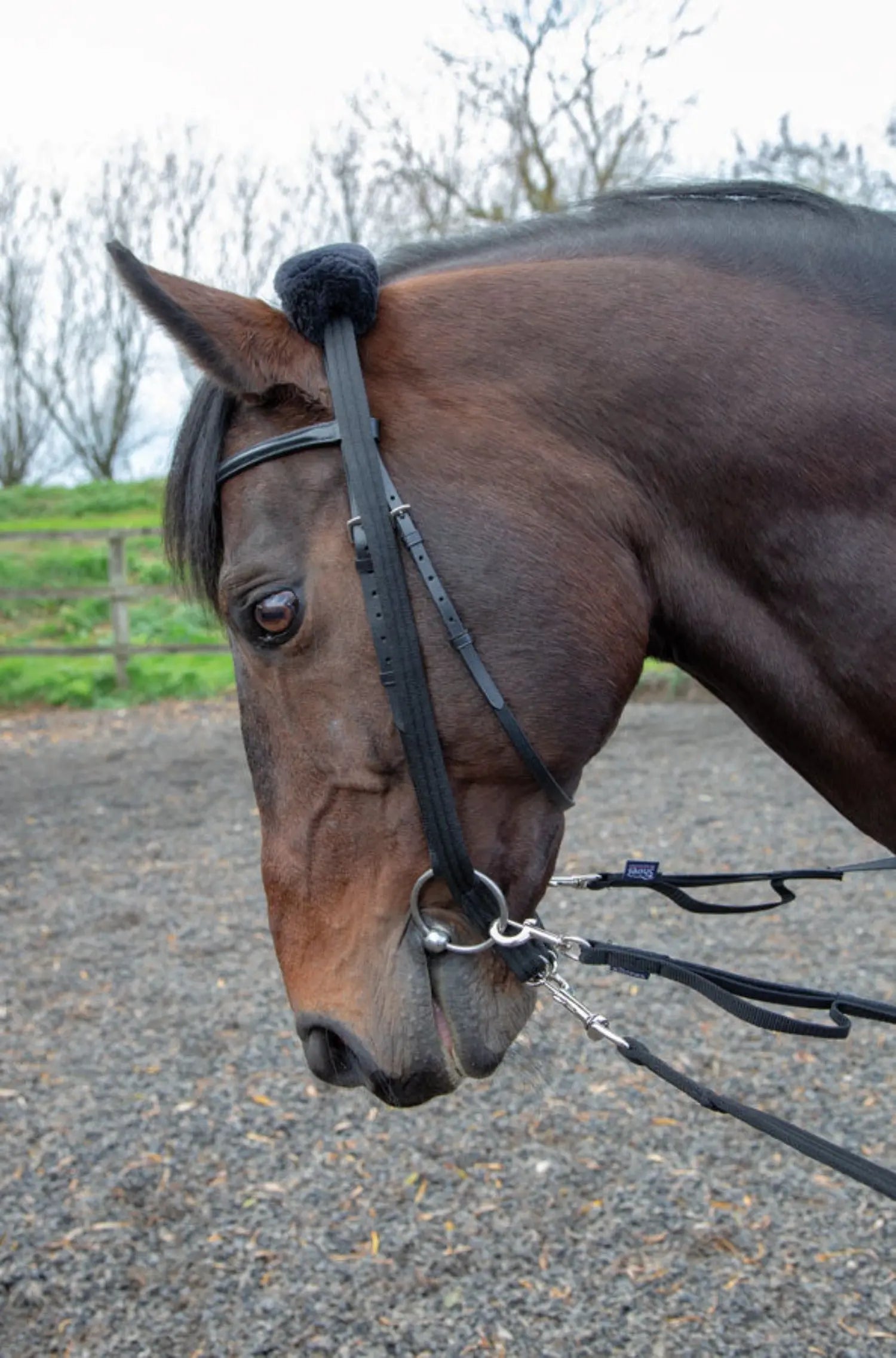 The Shires Lunging Adapter is suitable for lunging using a bridle, this adaptor removes the fiddly job of rethreading the lunge line when changing reins. The adaptor lays across the poll, threads through the bit rings and connects to the lunge line clip under the chin. Changing reins is simply a matter of turning the horse around. SupaFleece padding at the poll makes this lunging adapter ideal for sensitive horses.