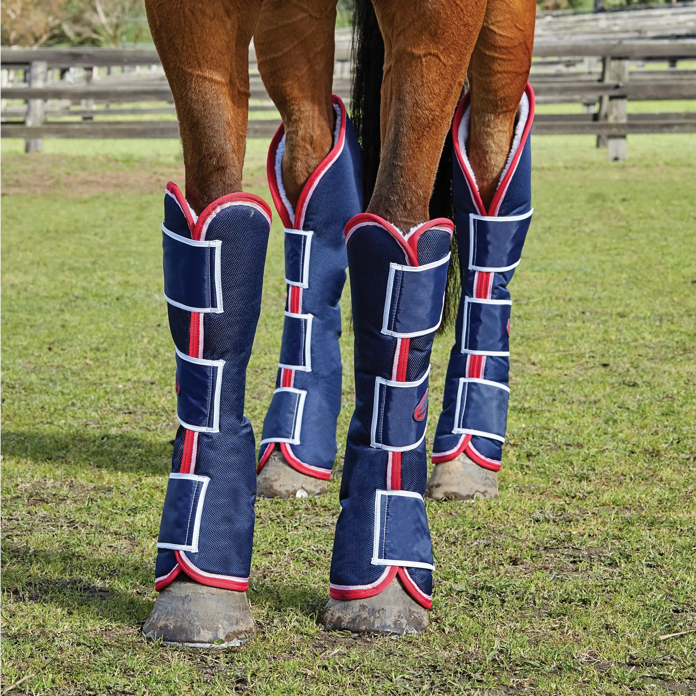 The WeatherBeeta Wide Tab Shaped Travel Boots are durable and strong protective boots with a 1200 denier outer shell. These boots are shaped to protect the entire lower leg while ensuring the horse is comfortable and able to move freely. Soft boa fleece lining offers additional comfort. The three touch tab closures are large, secure and easy to use, making these travel boots easy to put on and take off.