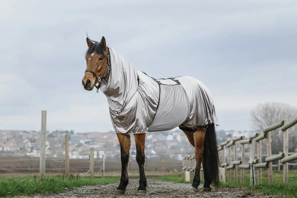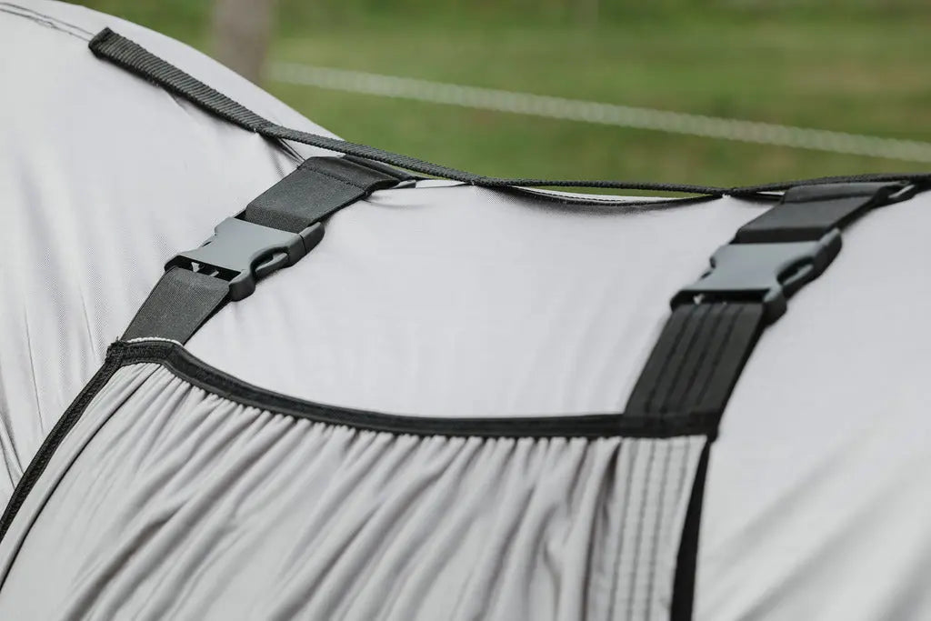 The material of this sweet itch rug allows for breathability to reduce sweat whilst reducing the damaging effects of UV rays on sensitive skin. The close fit to the horse's body fully protects from the neck to the tail. It is equipped with adjustable flaps at the base of the neck and adjustable elastic straps on the neck and around the legs.