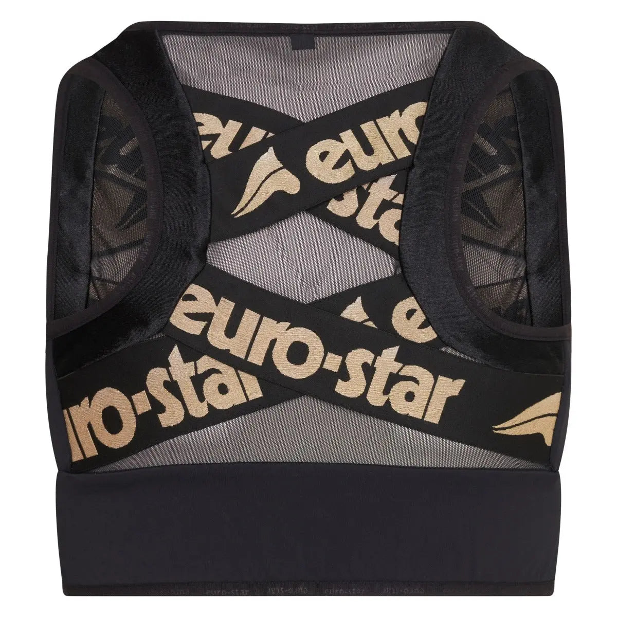 The Euro-Star Yoka Sports Bra is a functional sports top designed with gold contrast print branding to the elasticated straps on the reverse. Curved seams and breathable fabric ensure full comfort.